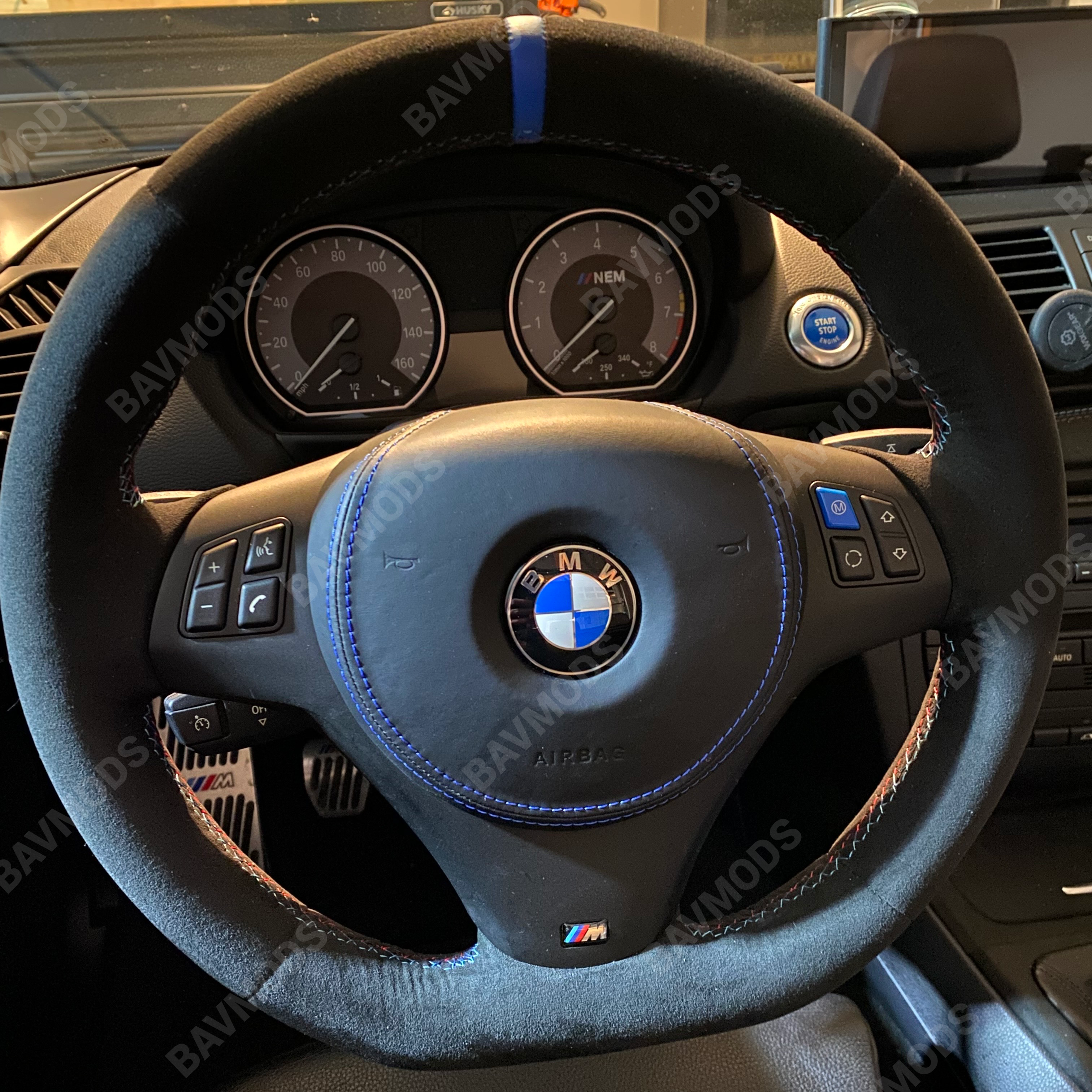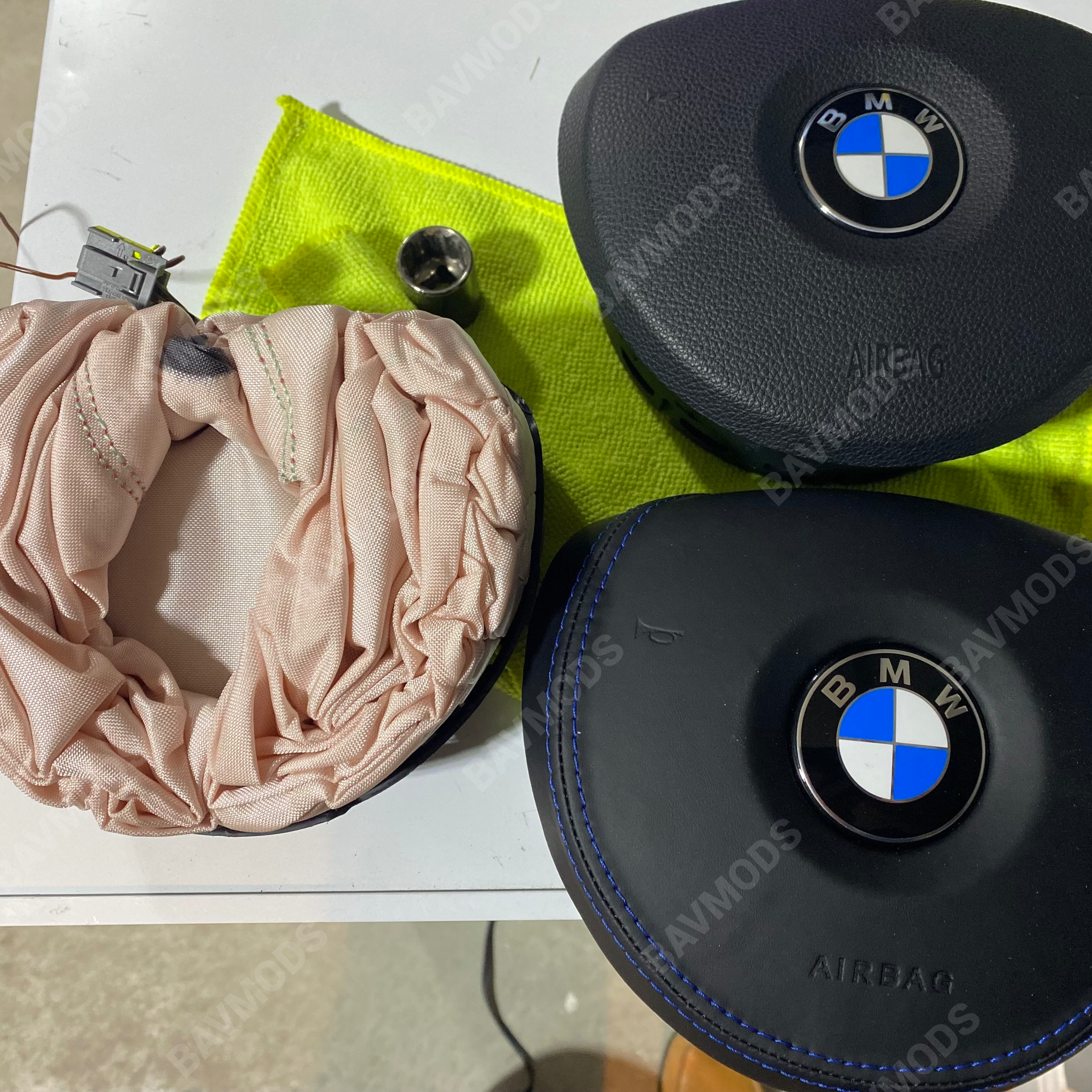 Enhance your BMW E8X or E9X Sport Steering Wheel with our handcrafted, premium airbag cover assembly. Designed to seamlessly replace your factory airbag cover, this upgrade elevates your interior with a sleek, black leather finish and ocean blue stitching, perfectly complementing dark black and blue interior accents.