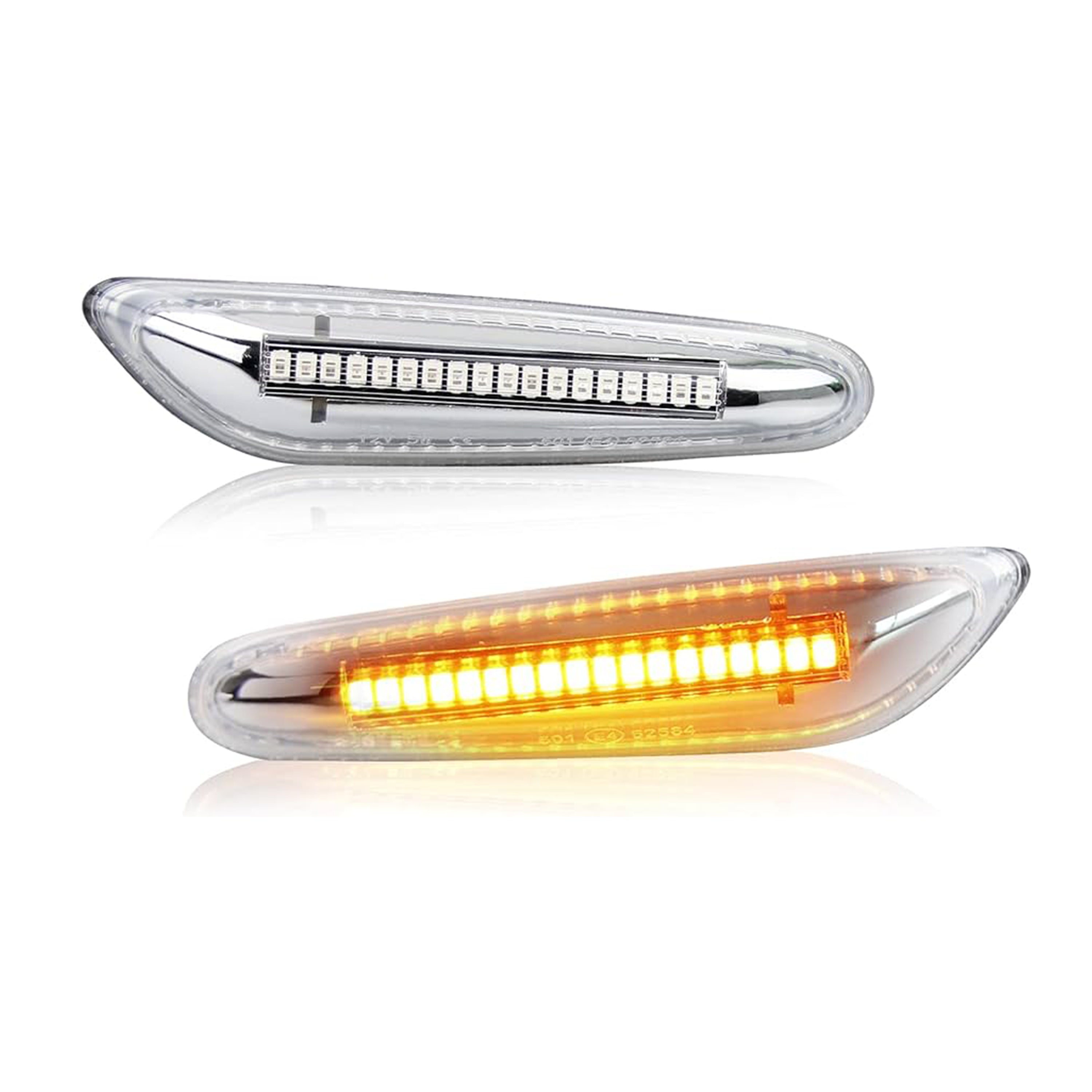 These side markers are engineered for Plug & Play installation on the E8X platform using the factory-style connector and mounting points. In most applications, that means no coding and no splicing—remove the original side markers, connect the new units, and snap them into place. The sequential pattern provides a smooth, eye-catching motion when signaling, while still maintaining a factory-correct fit and finish.