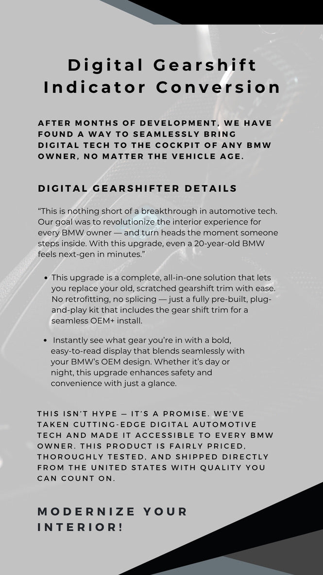 The BAVMODS® Digital Gearshift Conversion Kit replaces your outdated, dim gear indicator with a modern full-size LCD display, giving you a sleek, high-tech look while making it easier to see what gear you’re in — all at a quick glance. Designed with both form and function in mind, this is a complete plug-and-play kit that includes the entire surrounding trim panel pre-installed for a quick, hassle-free upgrade.