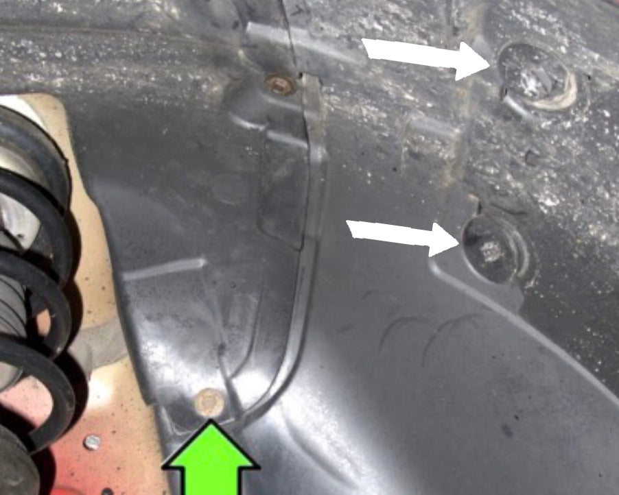 Remove the front fender liner cover that protects the headlight bulbs by loosening the retention screws (white arrows). If your fender liner doesn't have the cover, remove all of the 8MM fender liner screws and the one 10MM nut that holds the liner in place.