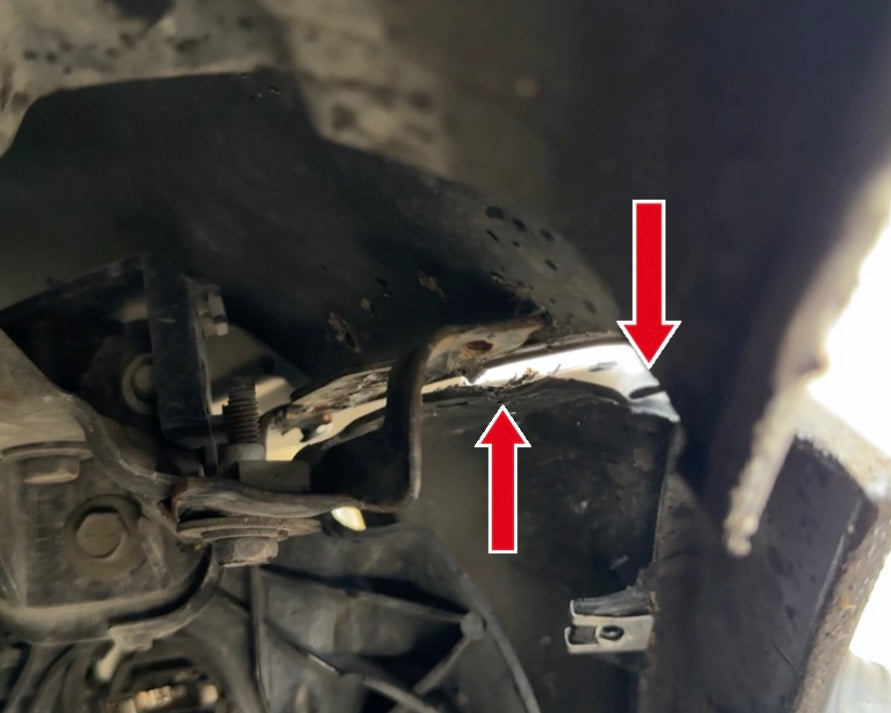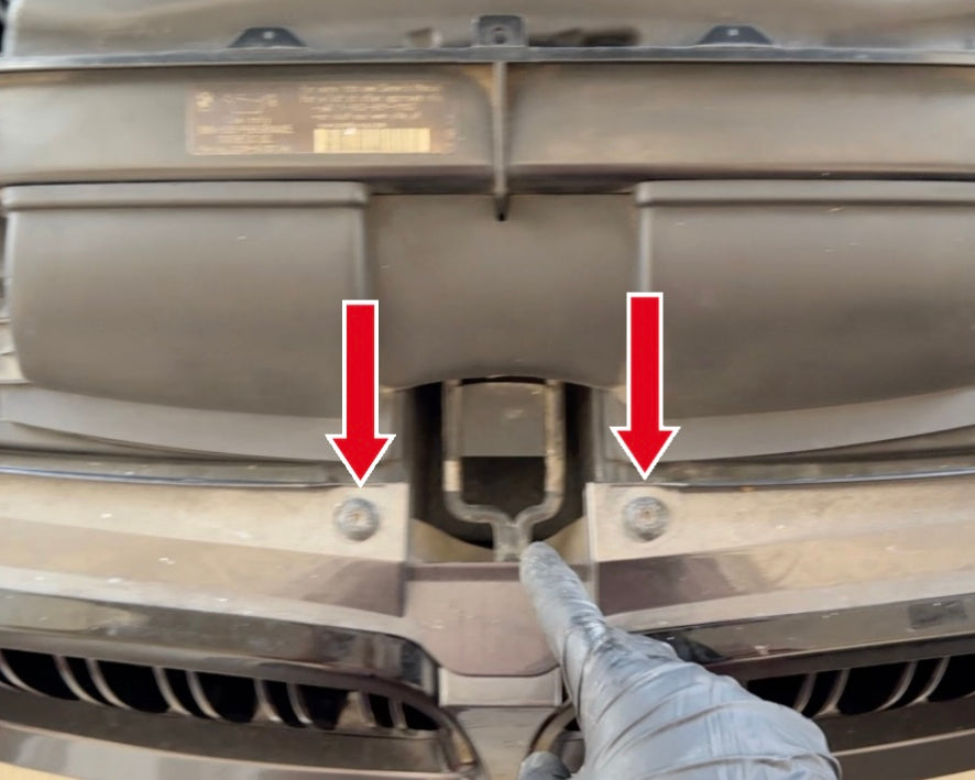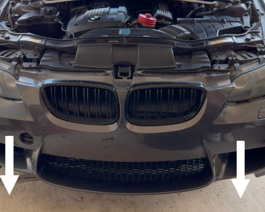 With all retention screws removed, the front bumper can be carefully pulled forward from the vehicle in the direction of the white arrows shown. Ensure the bottom of the bumper doesn't scrape on the floor. If the bumper does not easily pull from the vehicle, check connecting points to ensure no more screws are holding it in place.