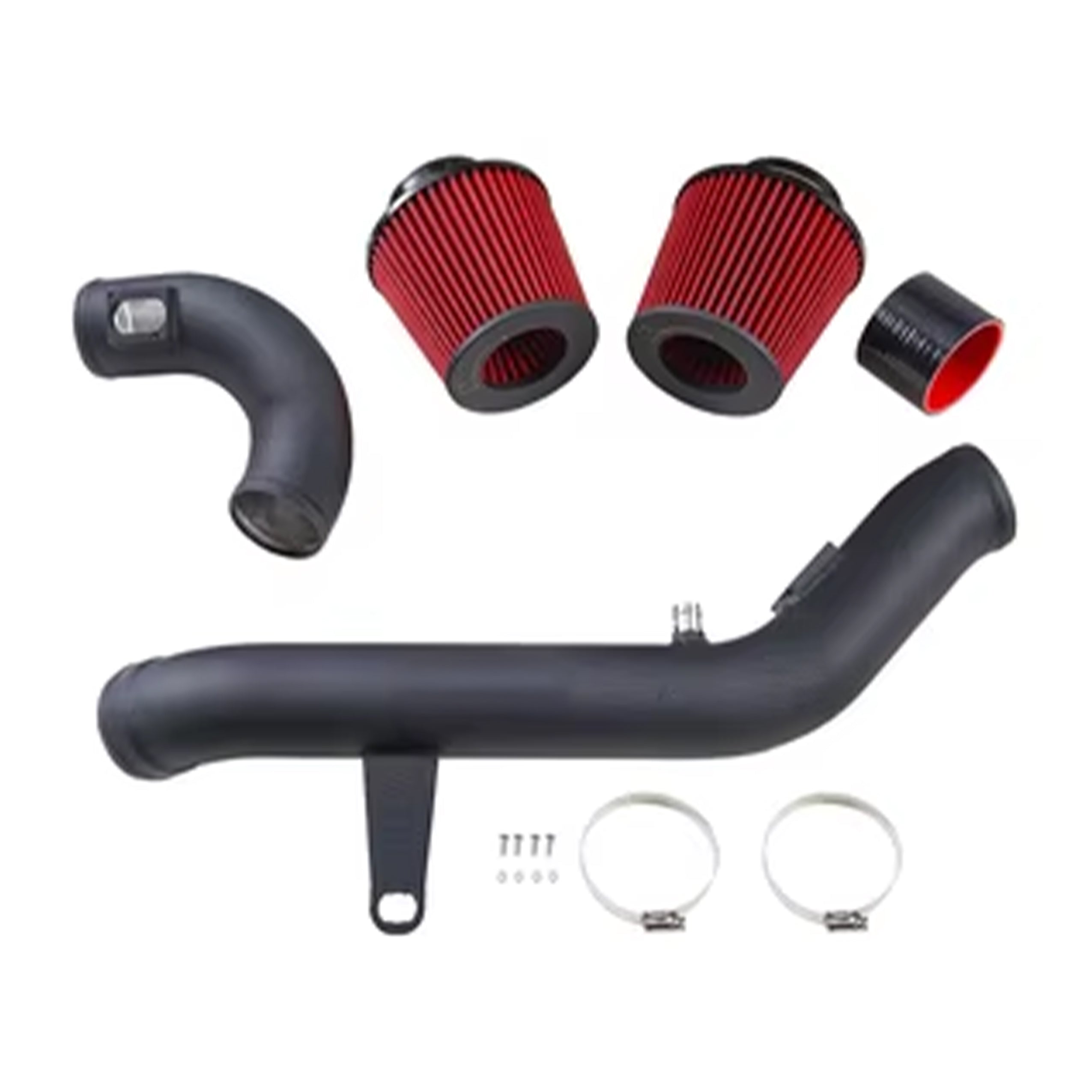 Constructed from reinforced silicone and precision-bent aluminum ducting, the system maintains strength and heat resistance while reducing turbulence under boost. Its smooth internal design channels cool, dense air directly into both turbo inlets — improving power delivery throughout the RPM range.