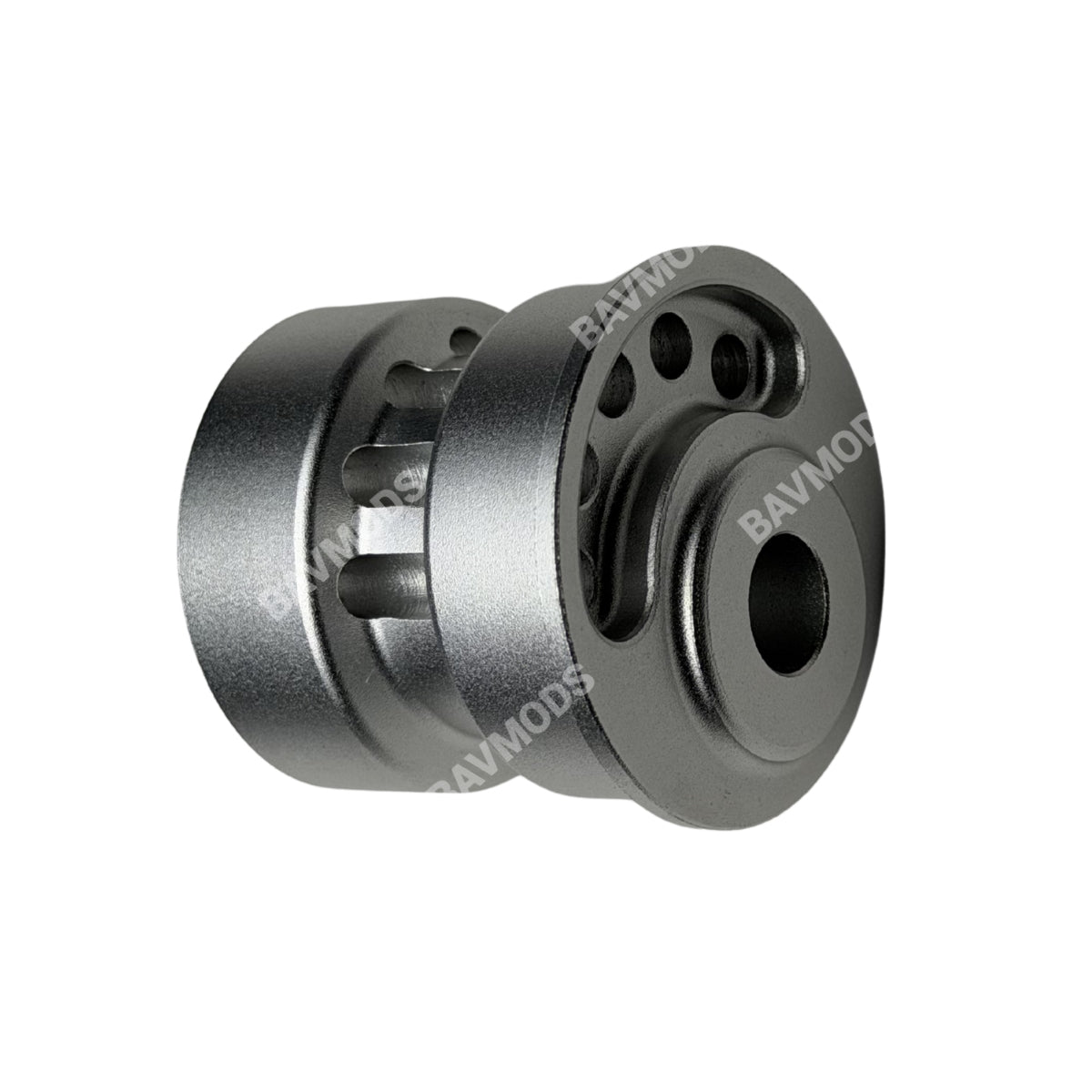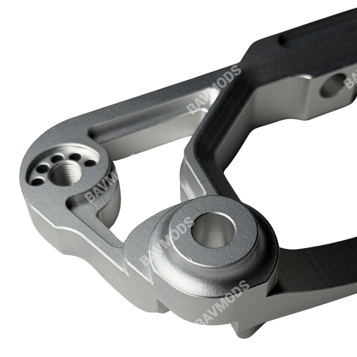 The factory rear axle design in the F8X chassis allows for noticeable flex under acceleration and cornering, which can cause delayed throttle response, drivetrain movement, and inconsistent rear traction. The BAVMODS® system replaces those weak points with reinforced performance-grade rubber bushings and a CNC-machined billet aluminum bracket, improving chassis rigidity without introducing harsh noise or vibration.