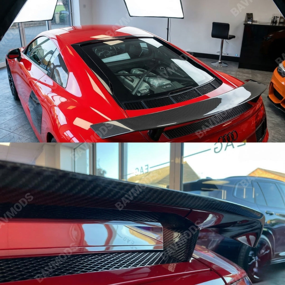 Refine the rear profile of your R8 with a premium carbon fiber spoiler that sharpens factory body lines while delivering the bold, aggressive OEM+ presence expected from Audi’s flagship performance platform.