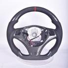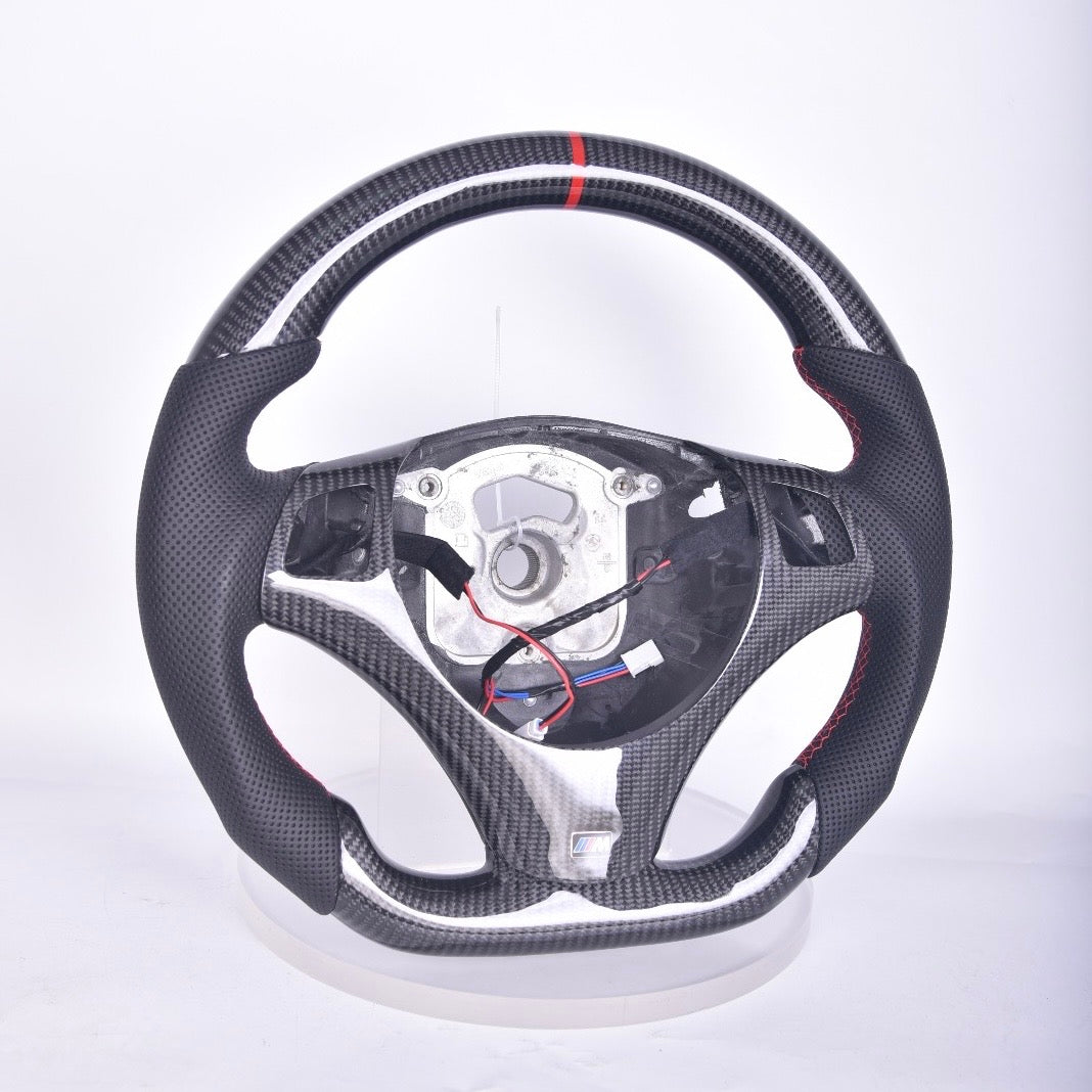 Custom BMW 1 / 3 / X / Z Series Flat-Bottom Carbon Fiber Heated Steering Wheel Preset 006 (Premade, 1 Left) | Blood Red Stitching and Stripe | E81 E82 E87 E88 E90 E91 E92 E93 M3