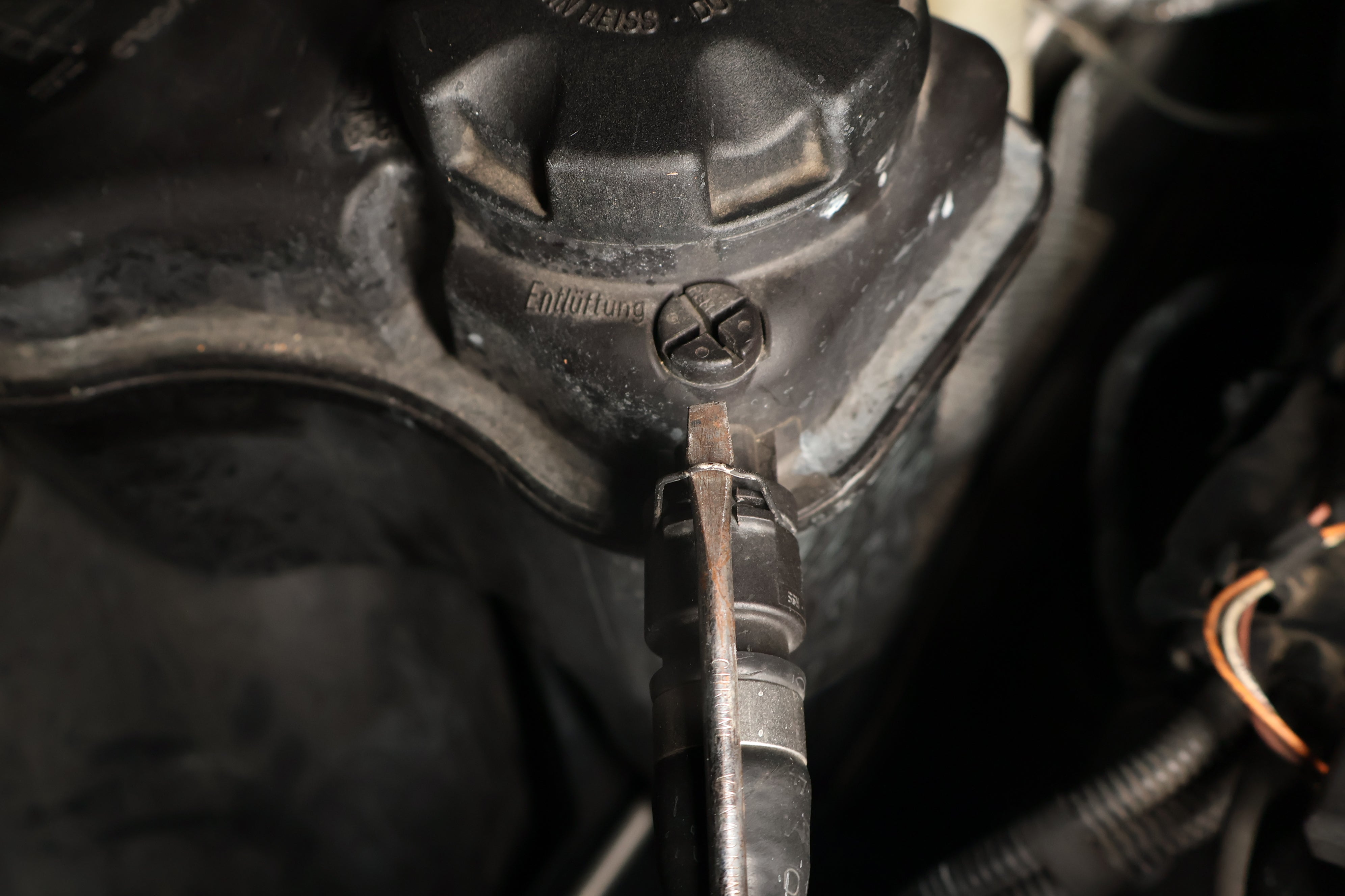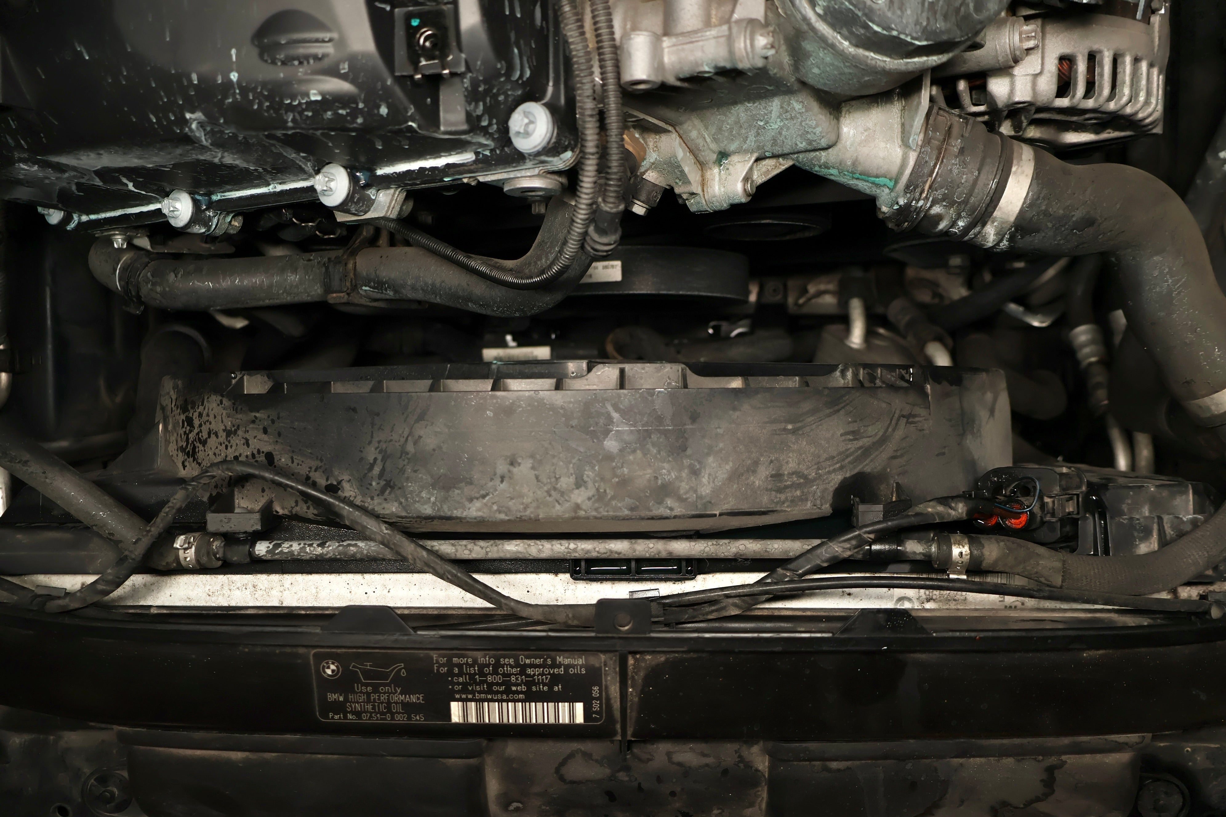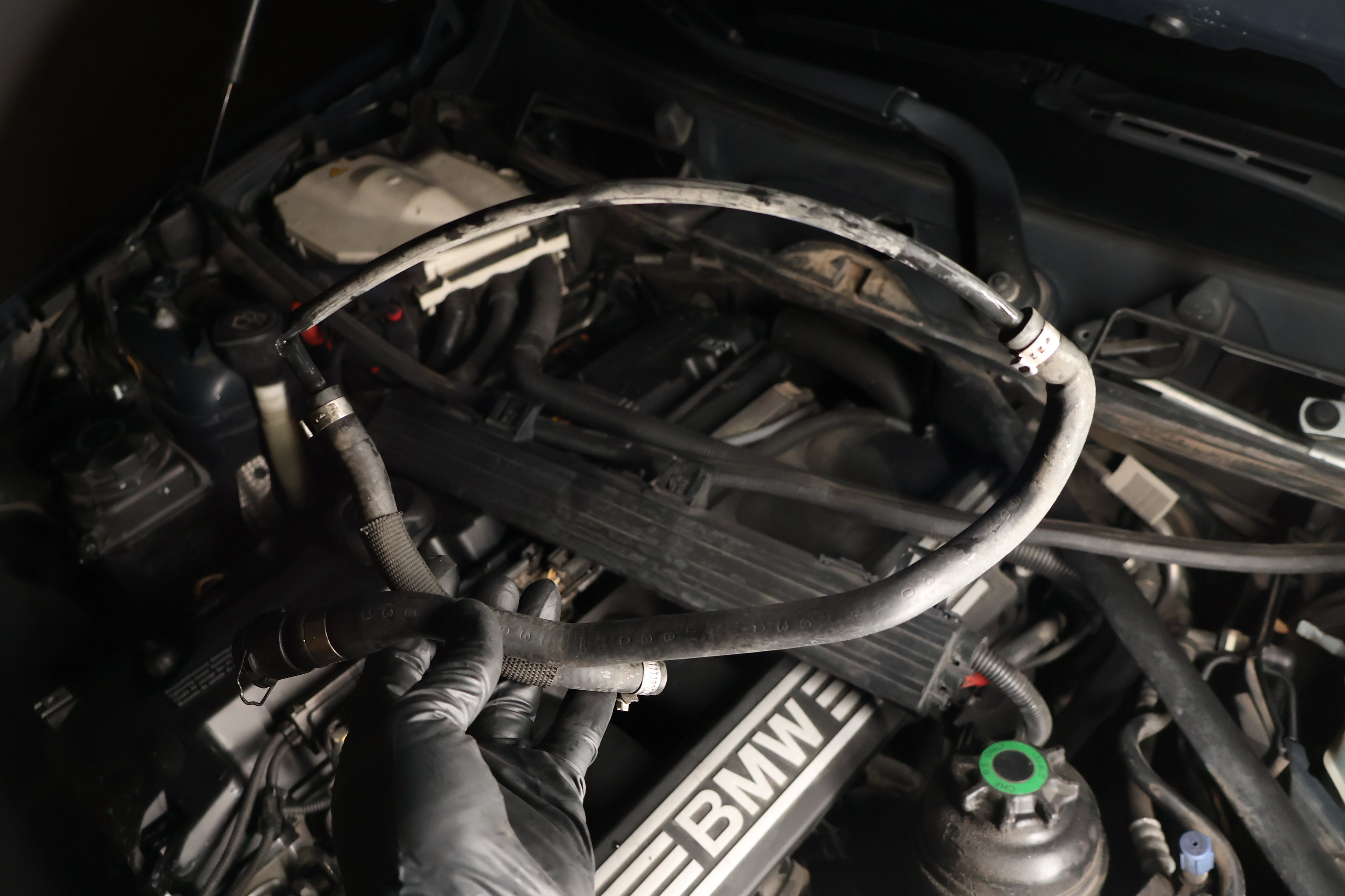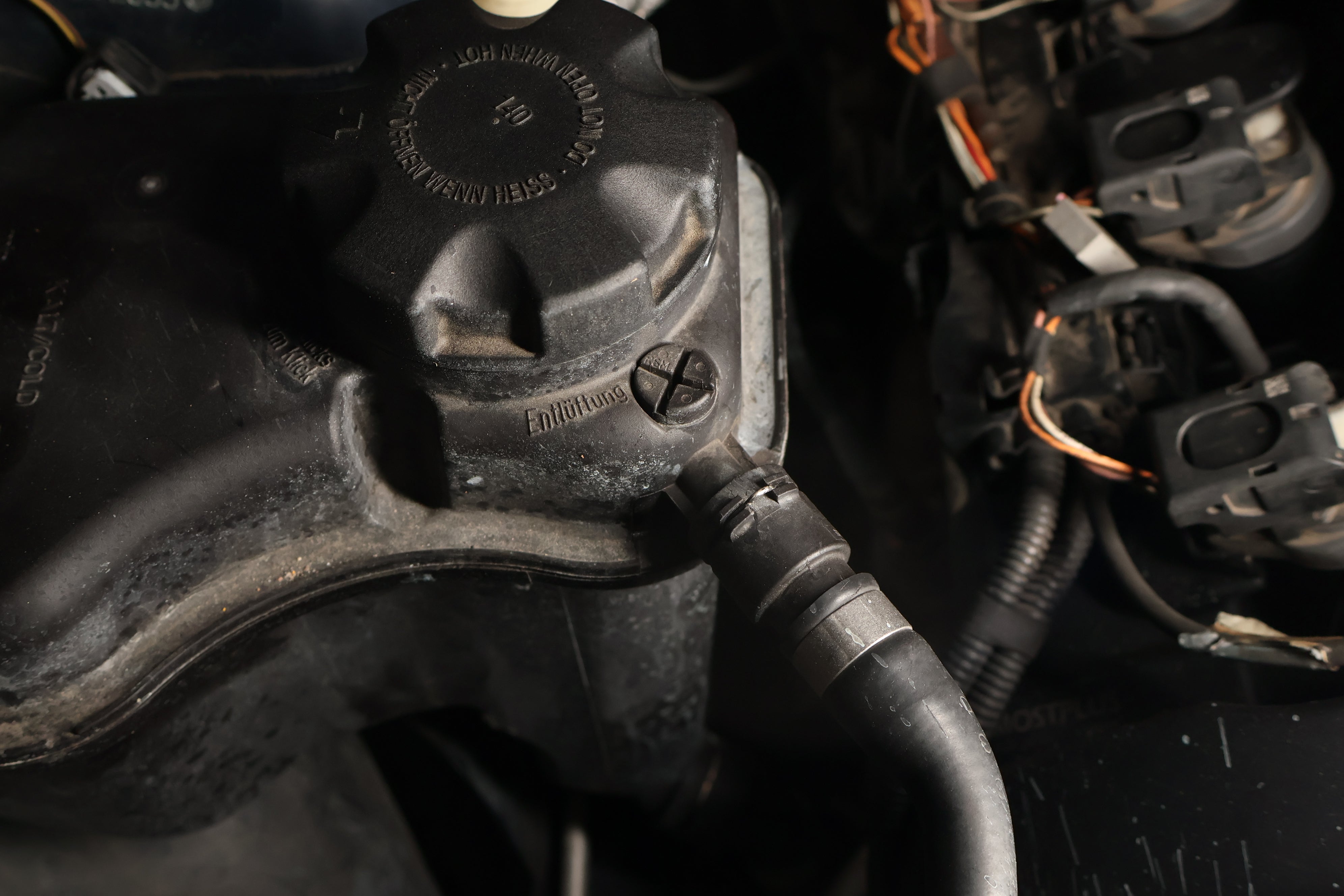 The expansion tank coolant recirculation hose's job is to recirculate air-free coolant from the engine into the expansion tank. Over time this hose might leak spraying coolant all over the engine cover as seen above.