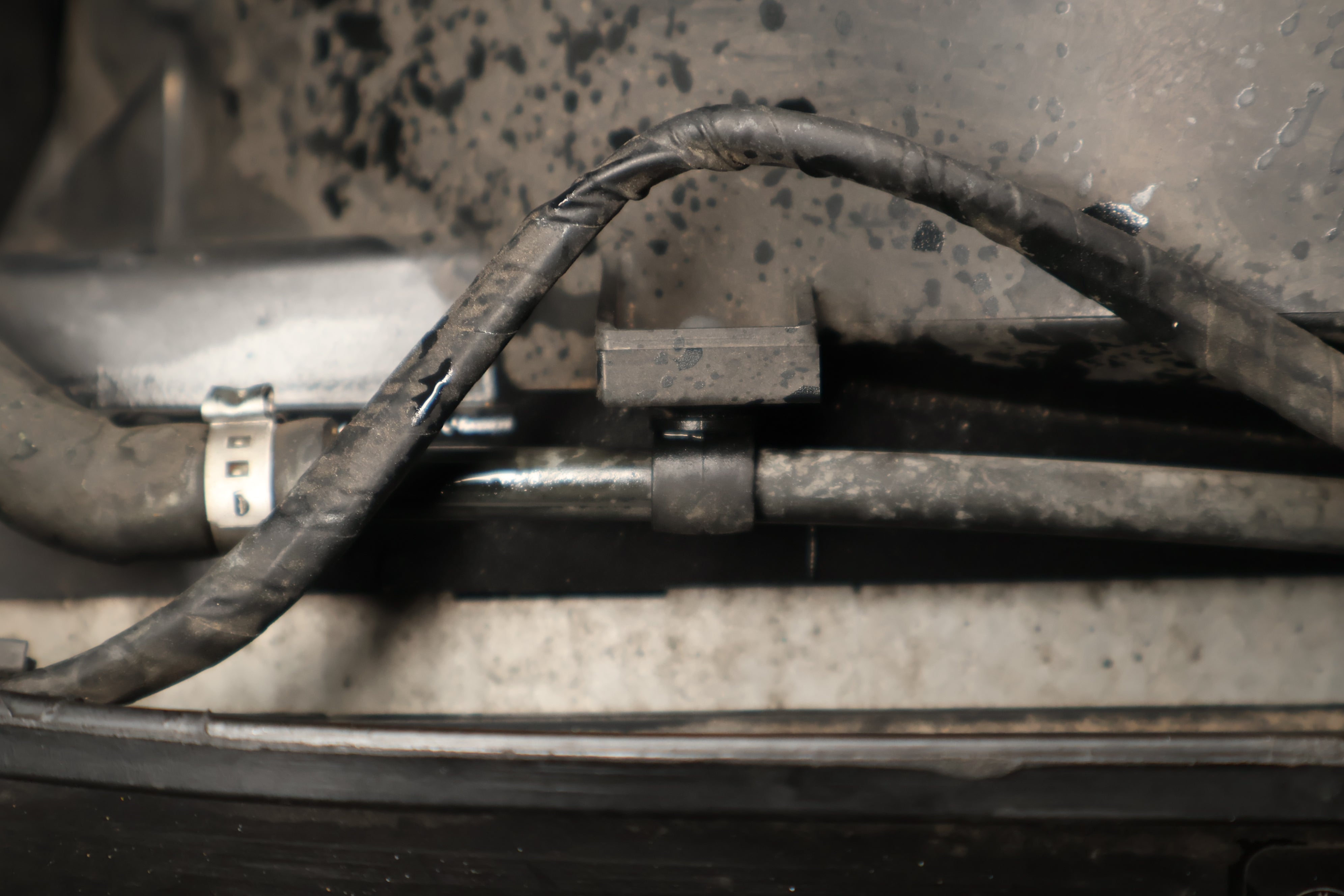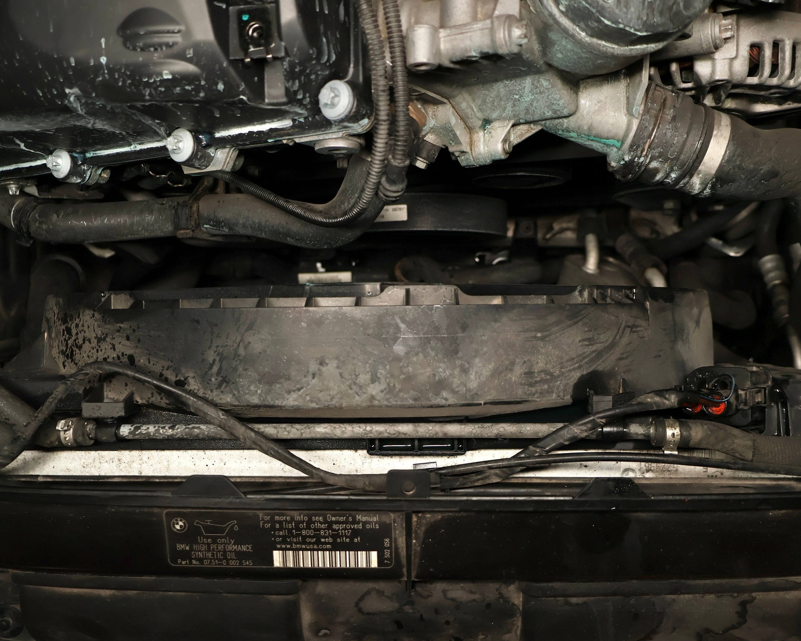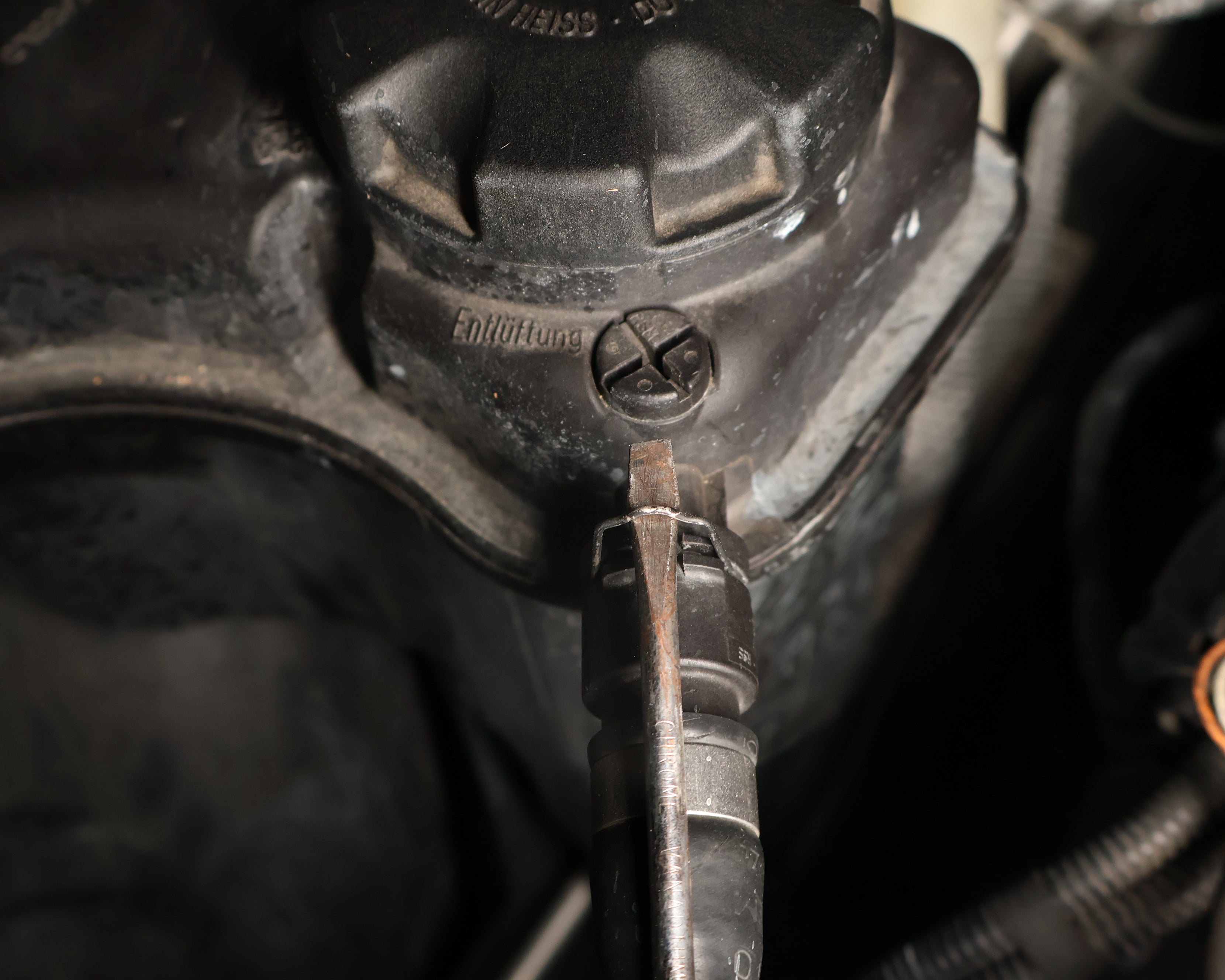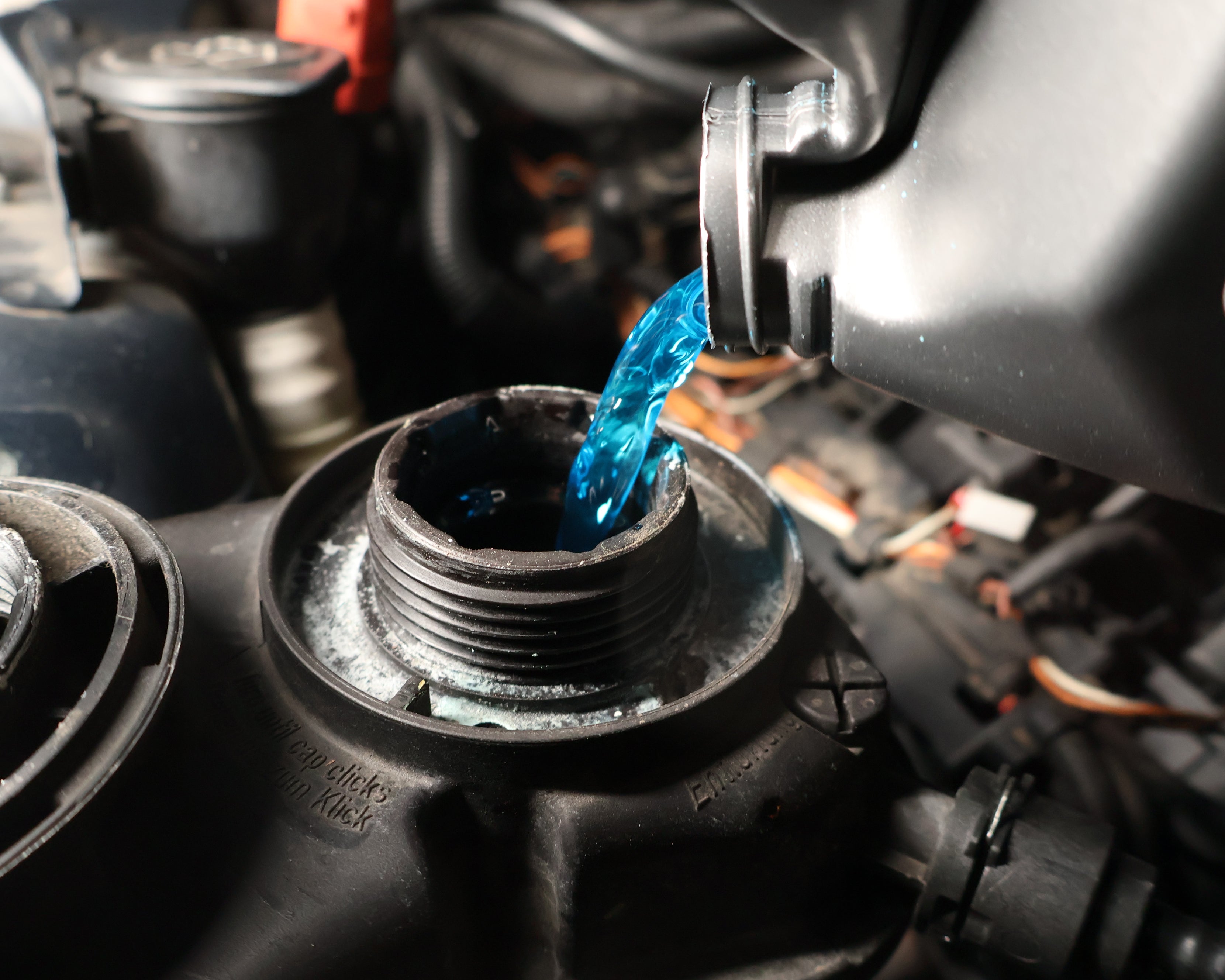 The expansion tank coolant recirculation hose's job is to recirculate air-free coolant from the engine into the expansion tank. Over time this hose might leak spraying coolant all over the engine cover as seen above.
