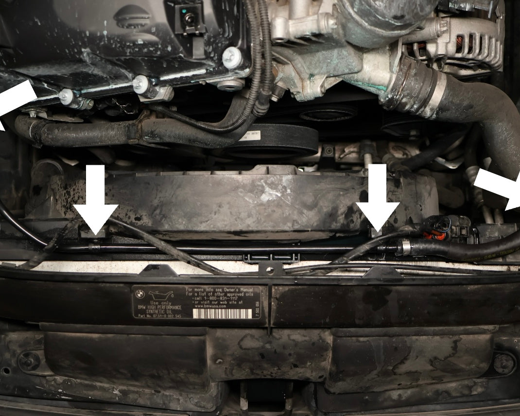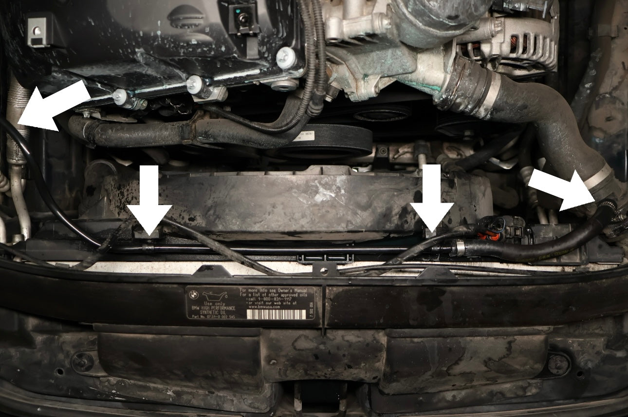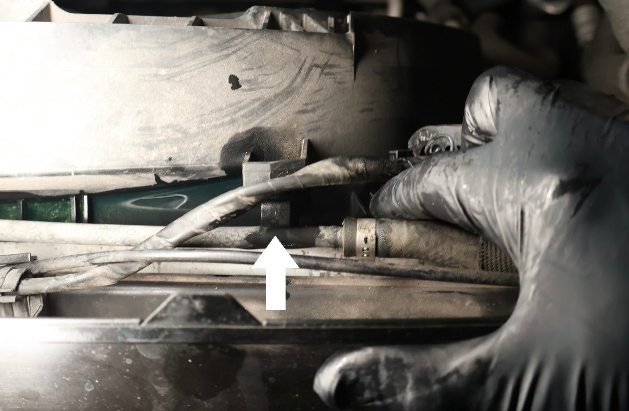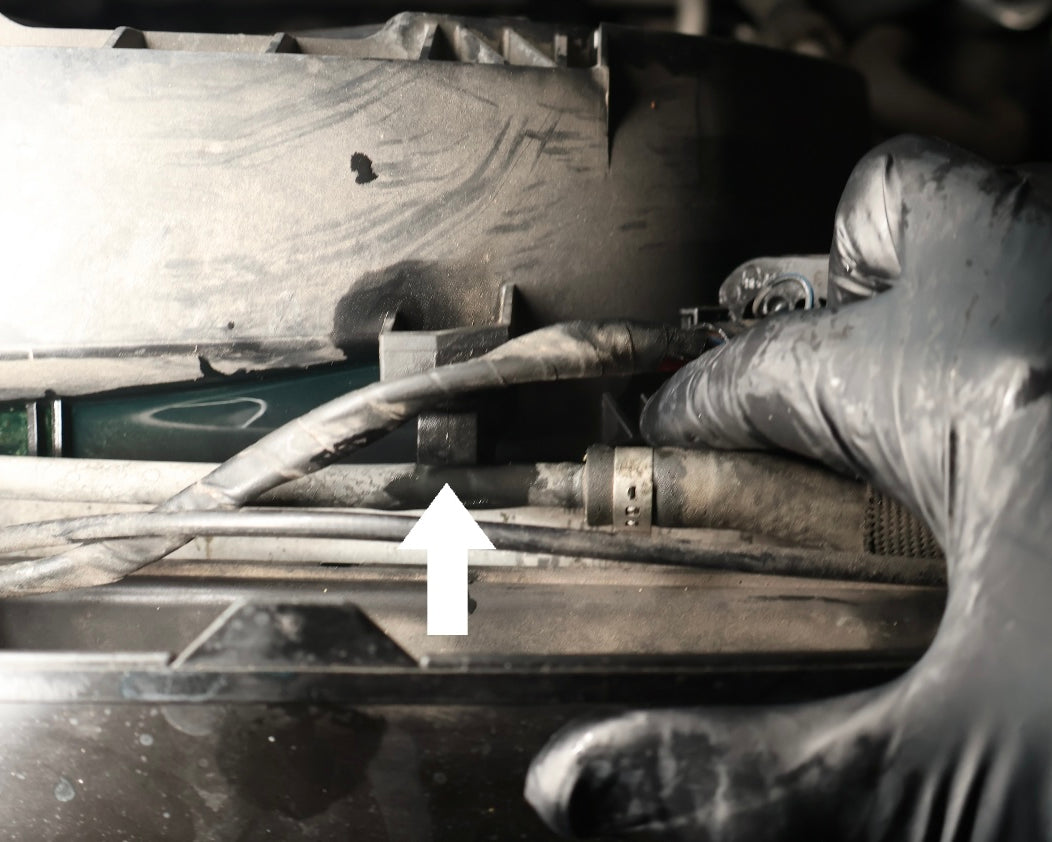 Unlatch the recirculation hose from the first fan shroud clip shown above (white arrow).