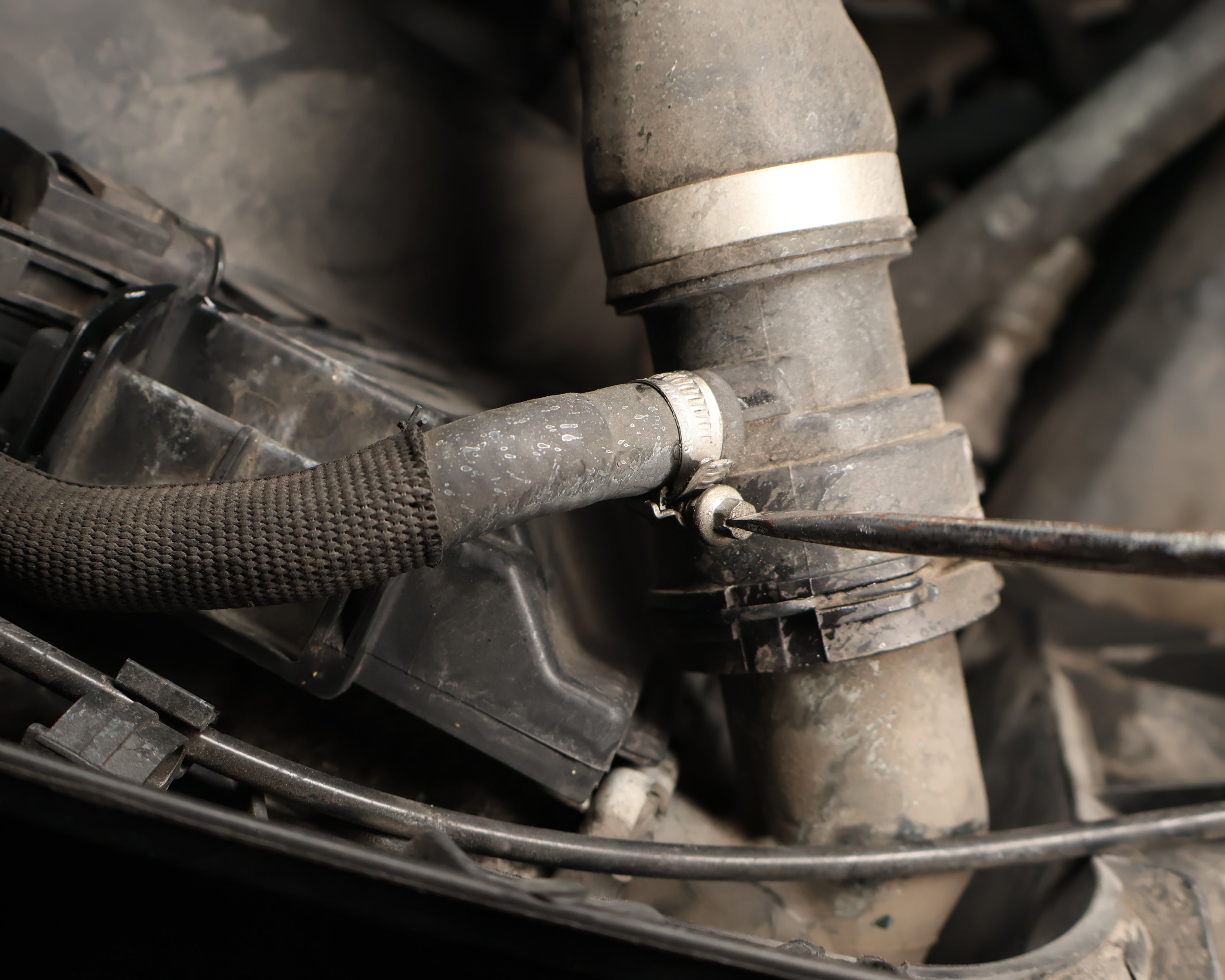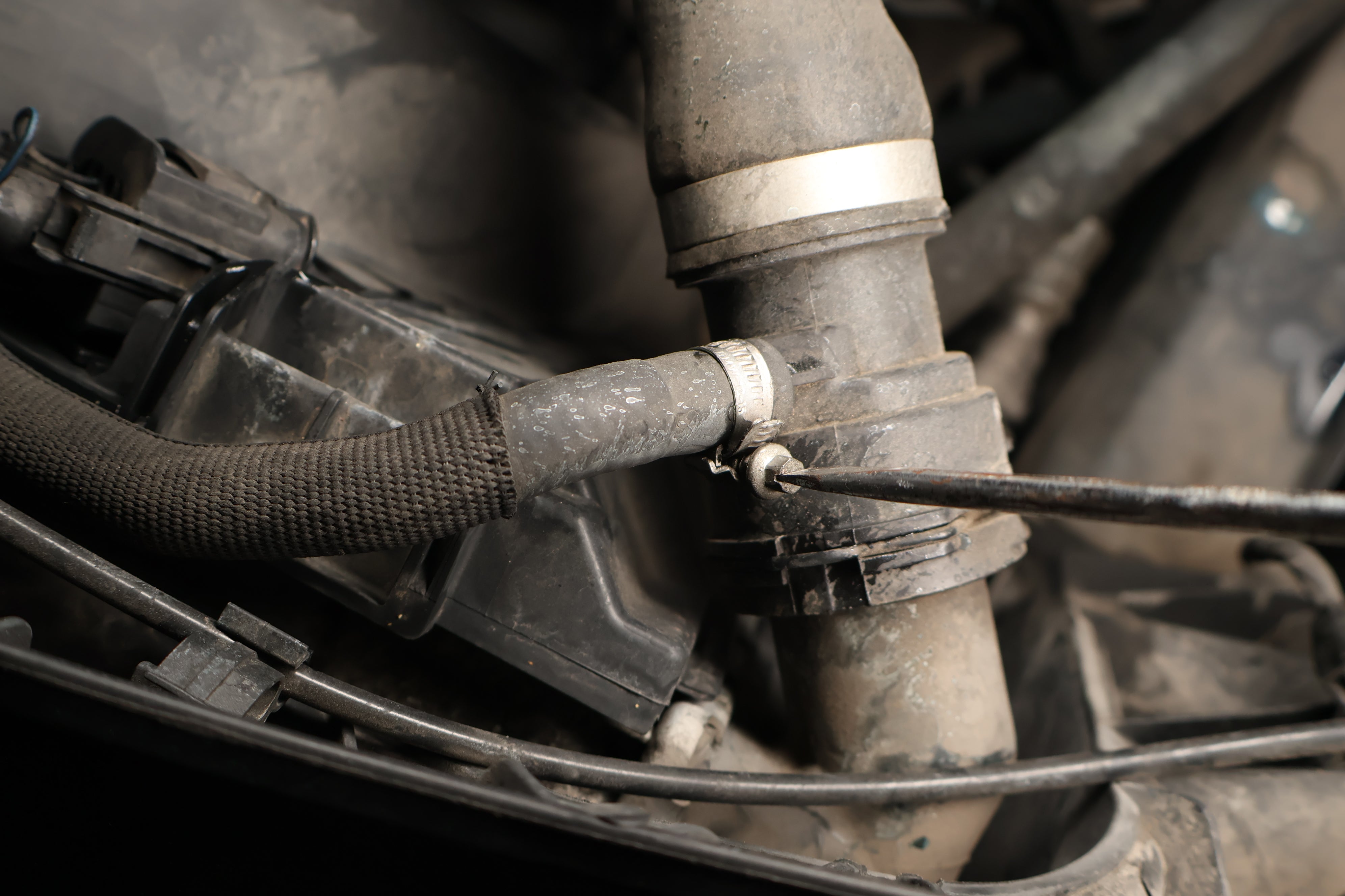 Using a flathead screwdriver, loosen the band clamp holding the recirculation hose to the upper radiator hose.