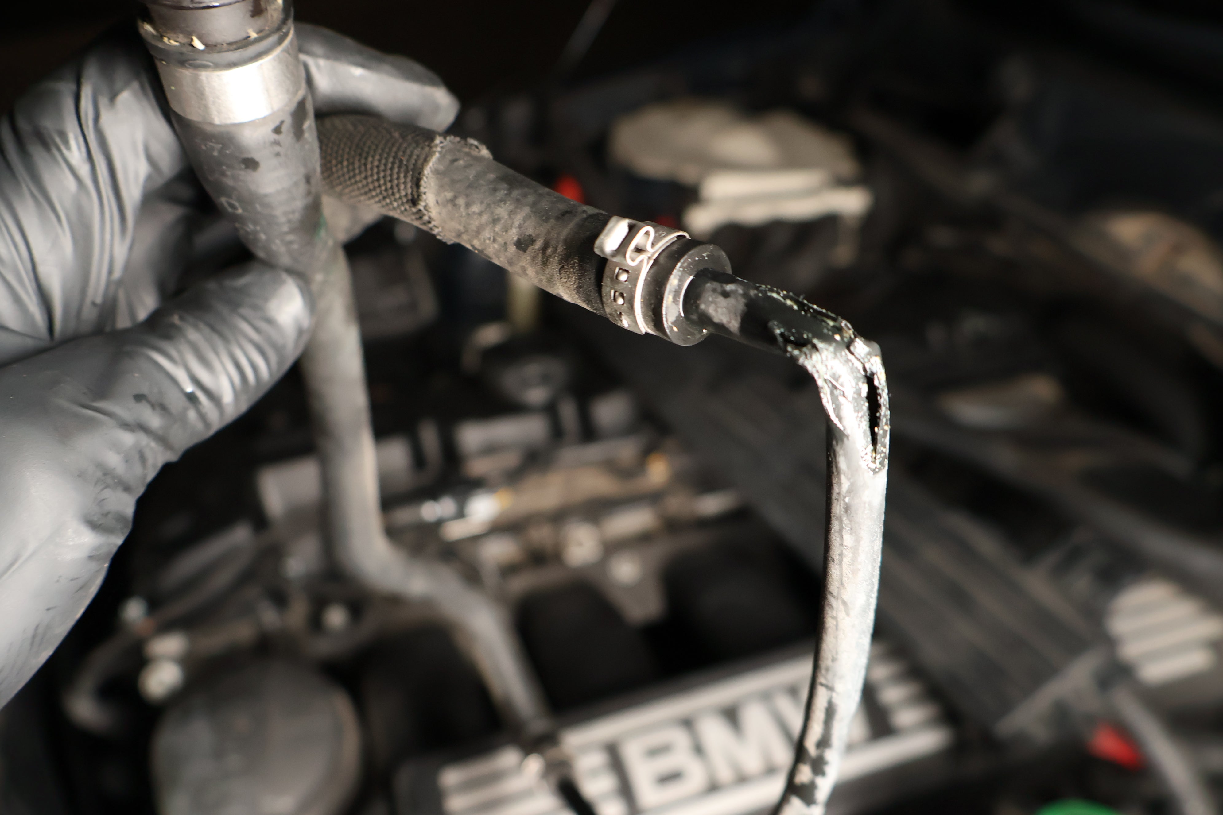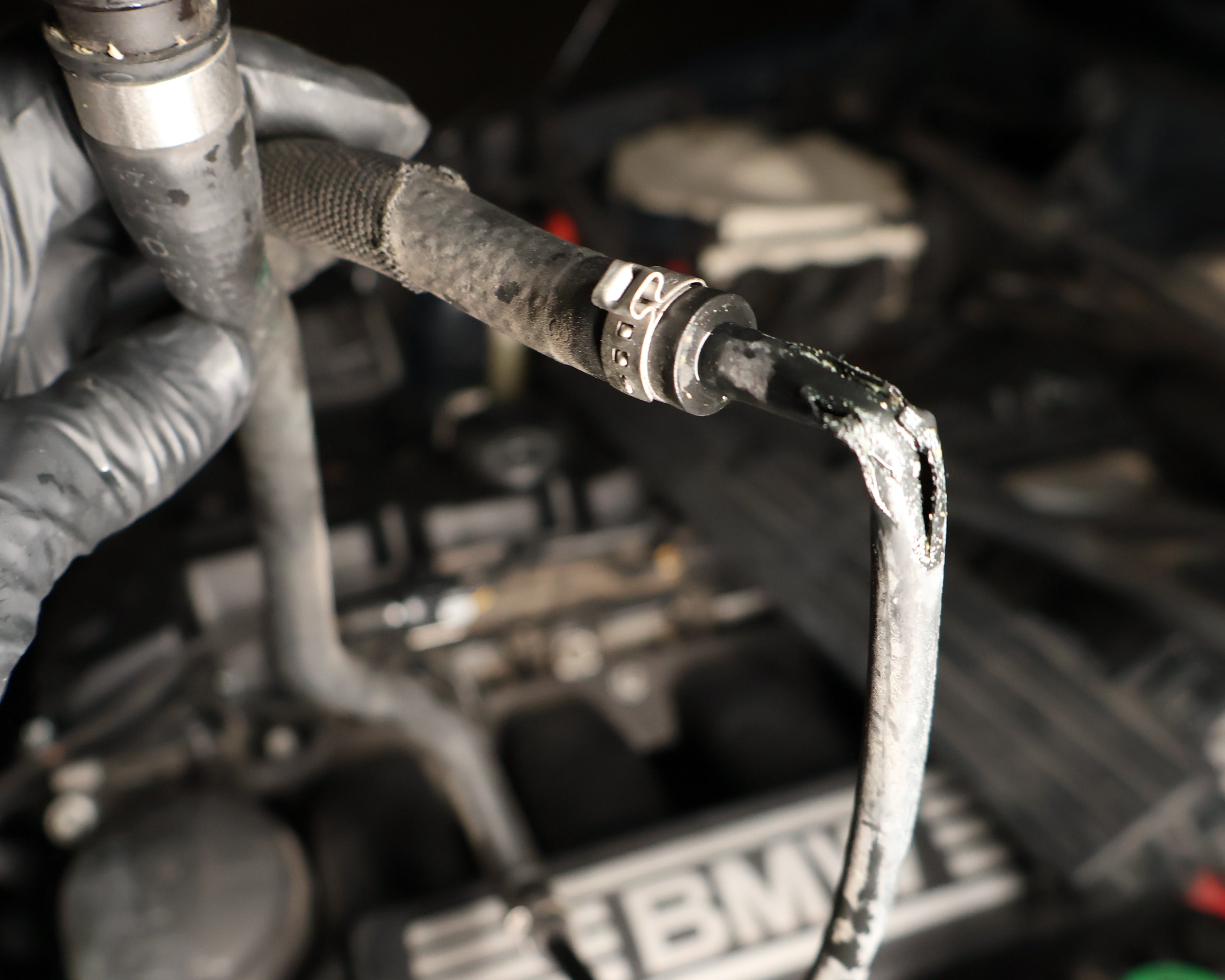 Due to the high heat the recirculation hose is exposed to, it commonly tears at the fan shroud clipping points. Shown above is the tear that caused this vehicle to spray coolant all over the engine bay.