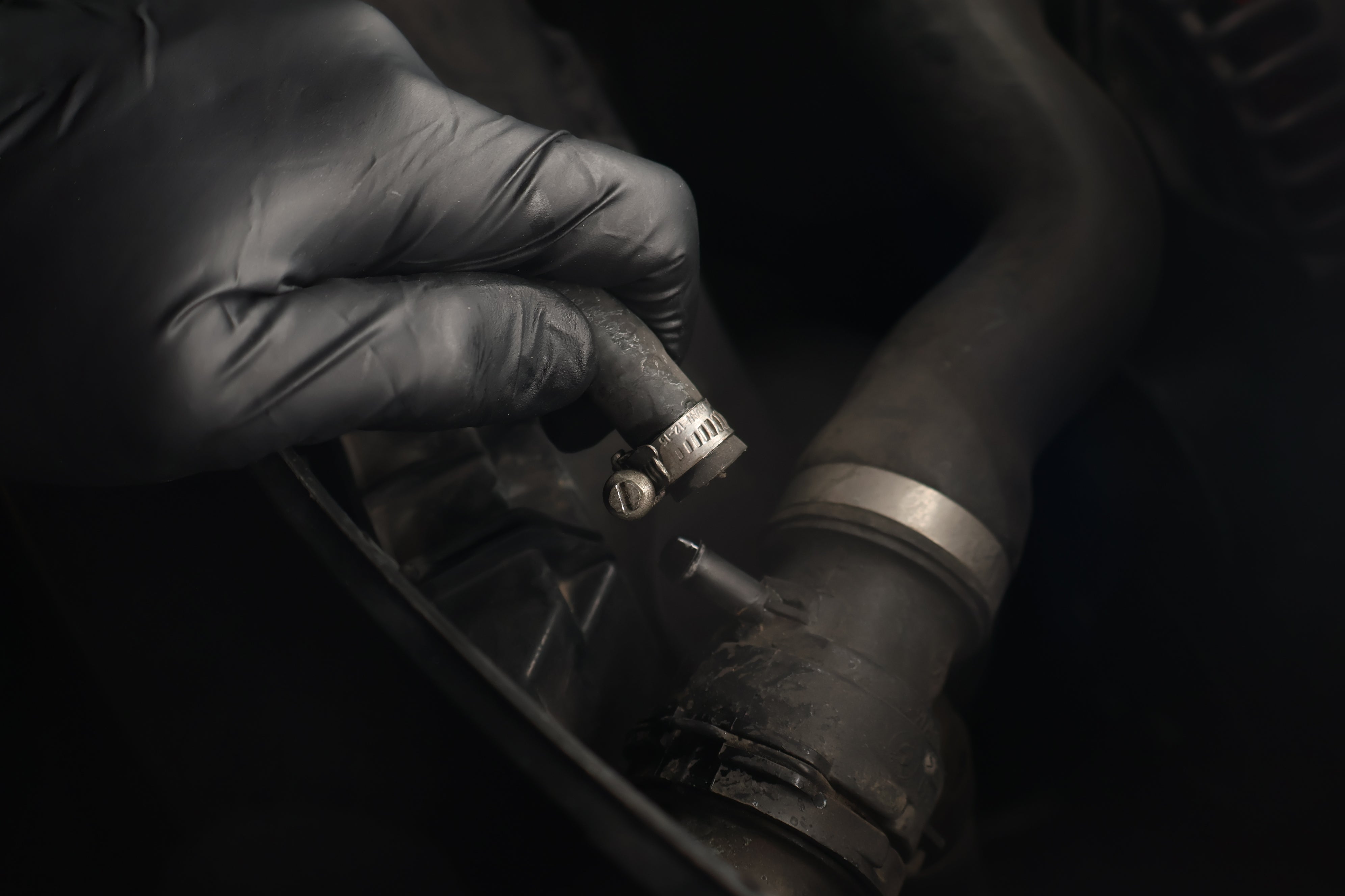 Once the band clamp is fully loosened, pull the old recirculation hose from the nipple on the upper radiator hose.