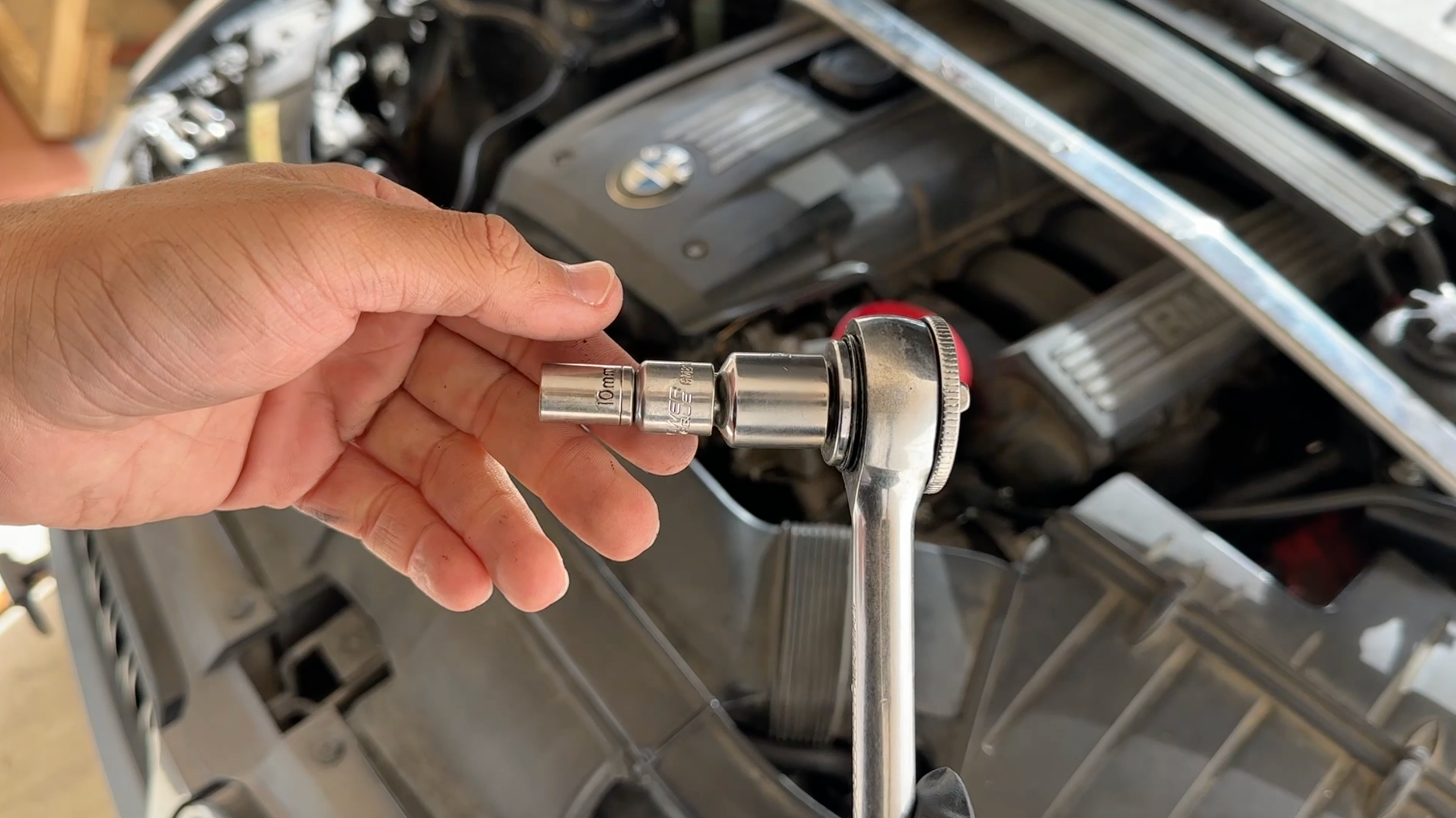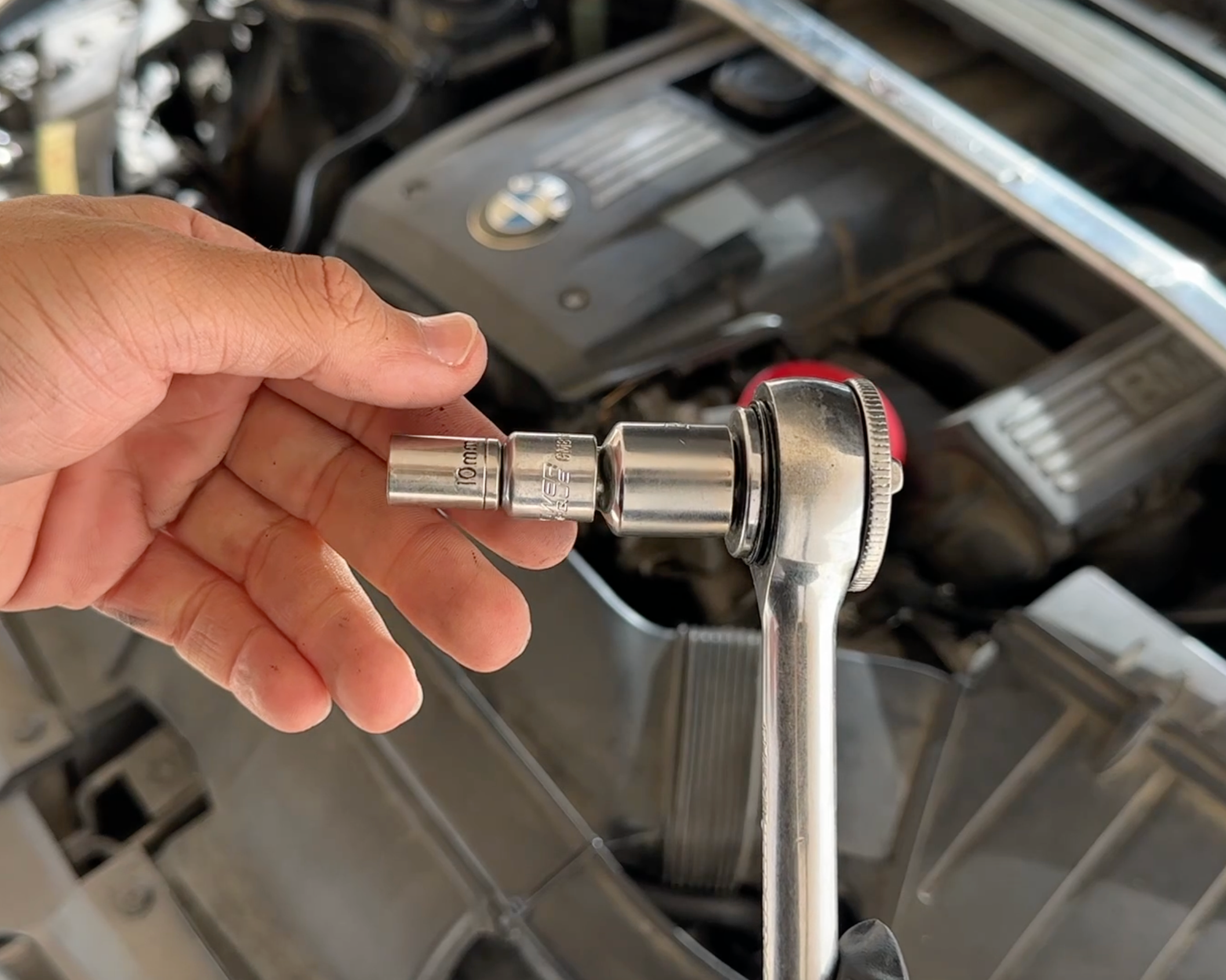 Remove the rear screw from the cylinder head hose using a 10MM socket and ratchet.