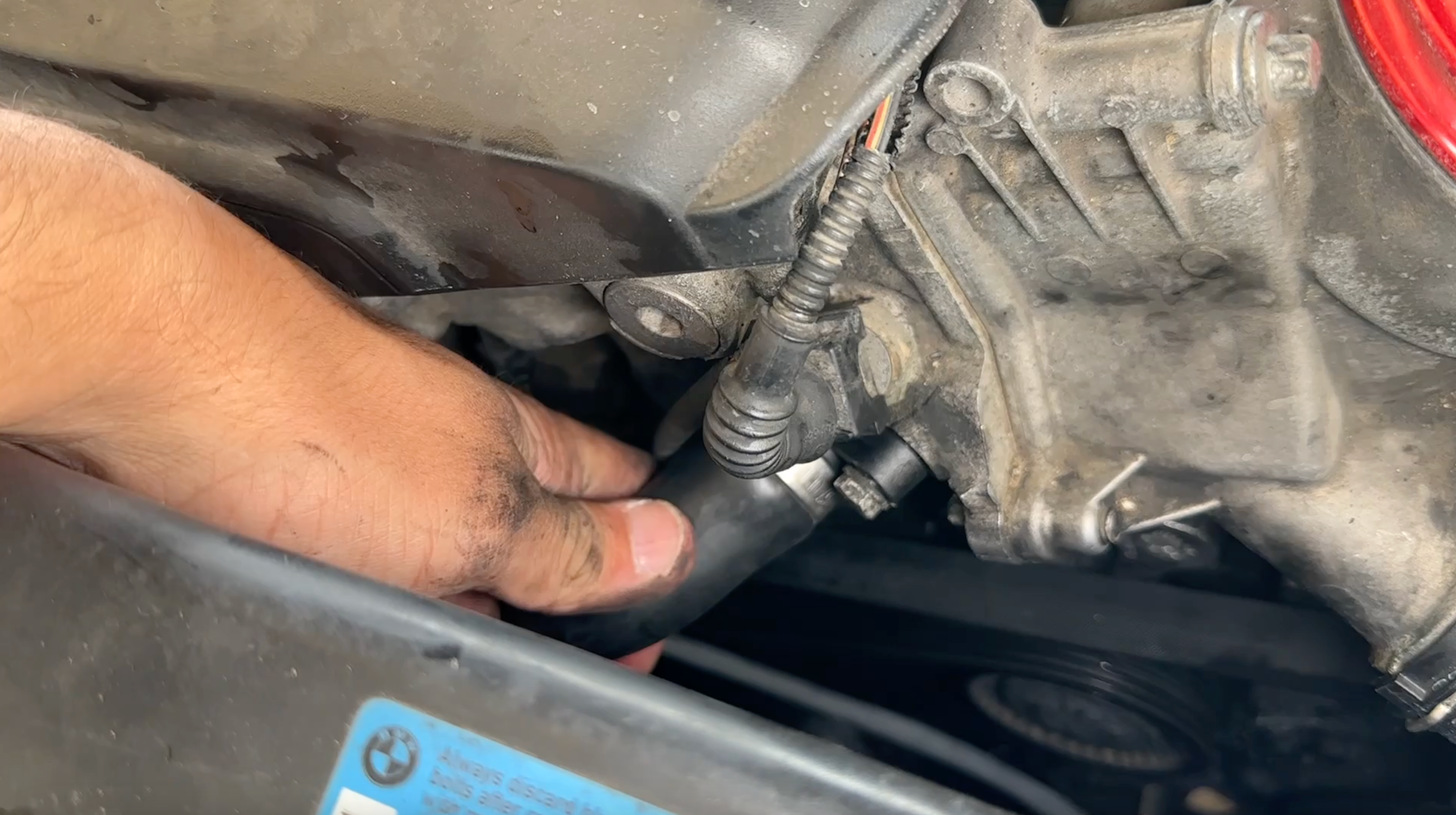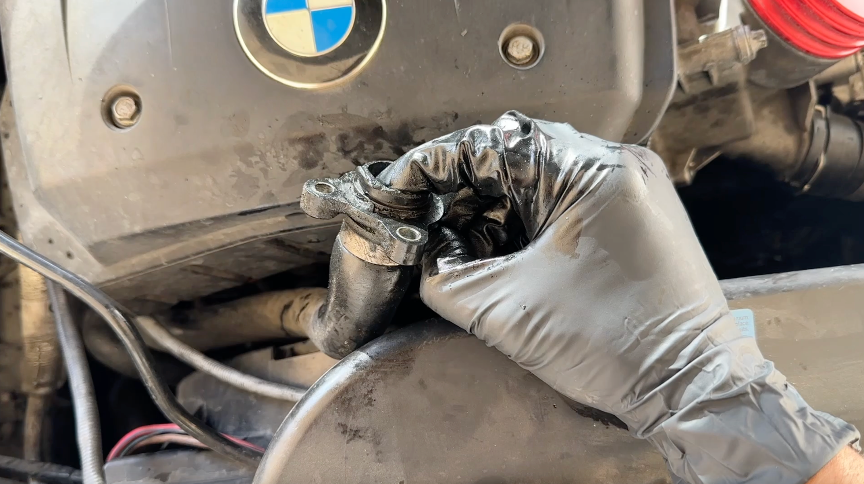It's extremely important to check the hose port on the cylinder head for any debris. The old hose almost always breaks off small plastic pieces that could possibly fall into the engine. Trace your finger in a circular motion and check there are no plastic pieces broken off.