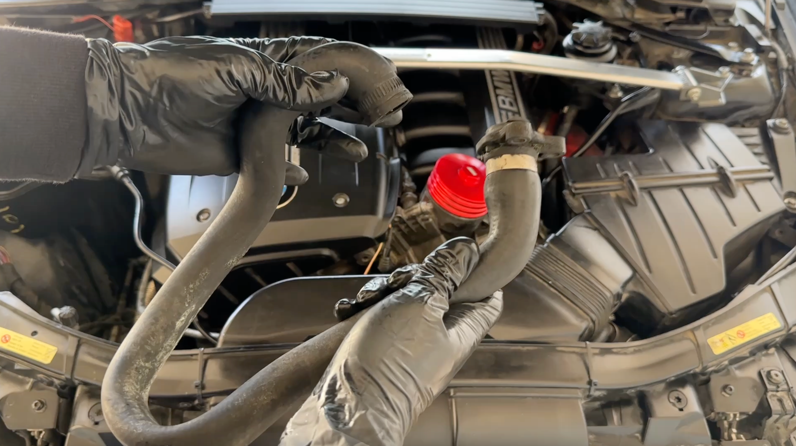 Disconnect the expansion tank return hose by prying up on the metal retention clip and simply pulling it off of the nipple.