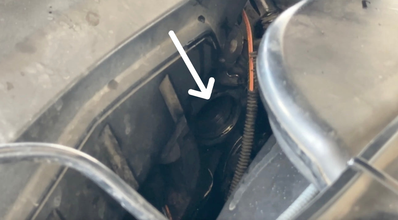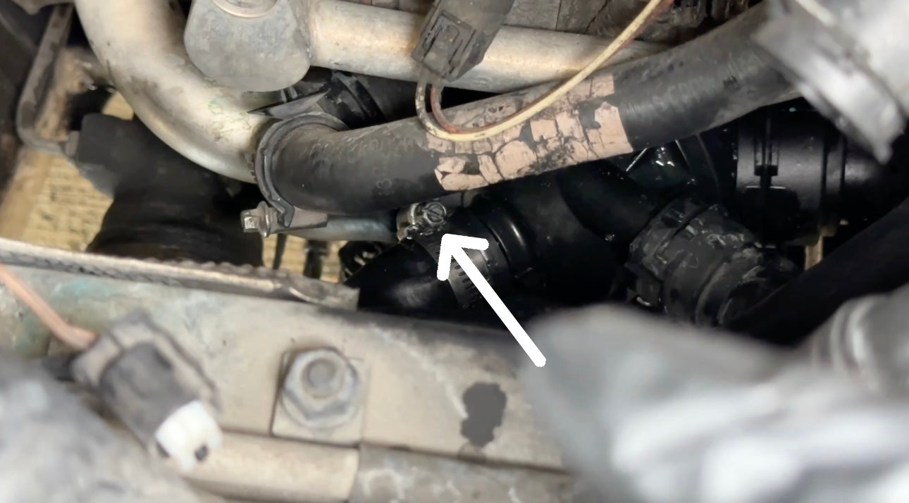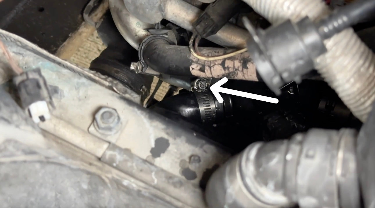 Loosen the band clamp holding the hose to the thermostat (white arrow) with a flathead screwdriver. Once loosened, pull the hose from the thermostat.