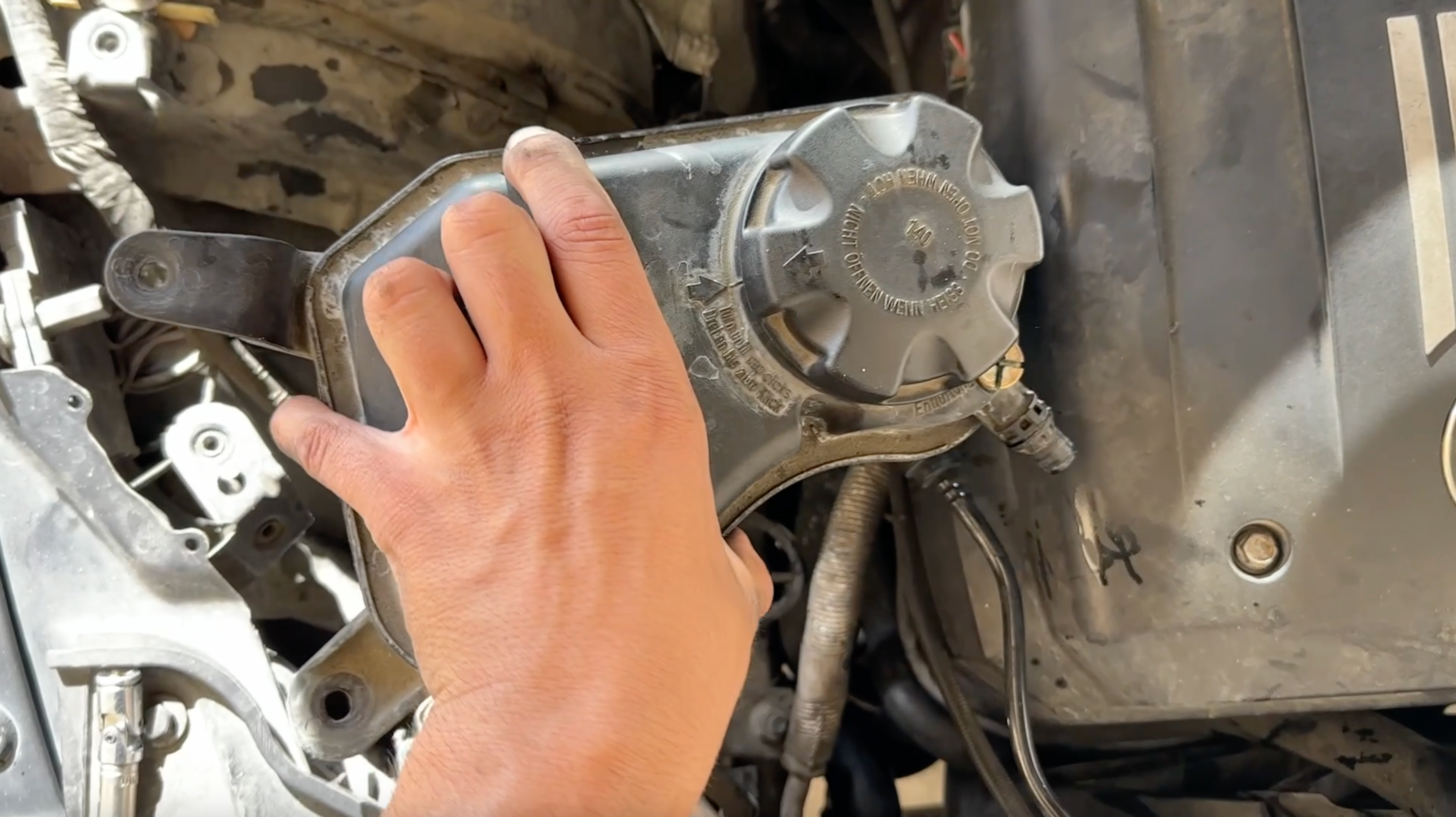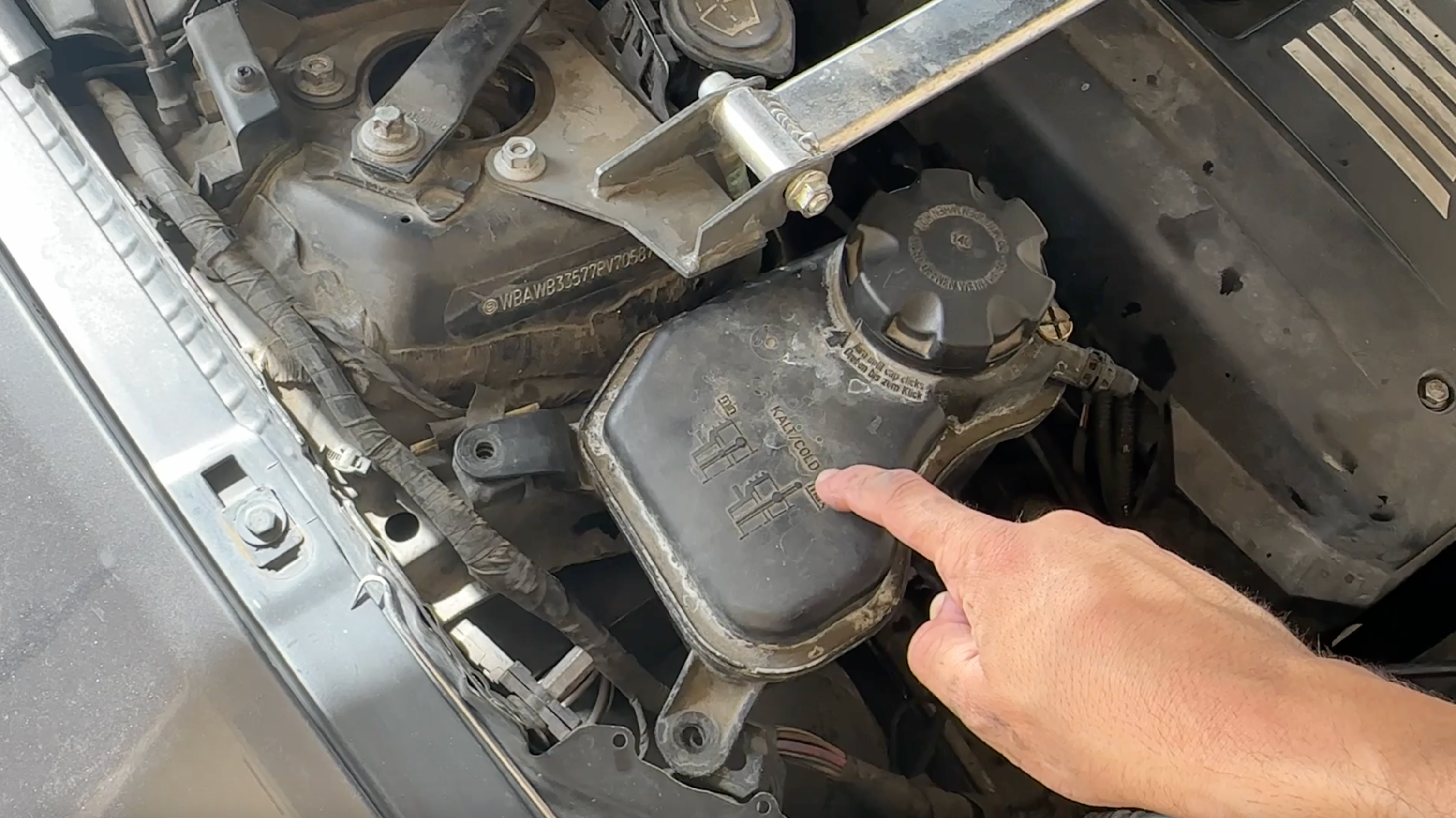 Move the expansion tank all the way forward, to give yourself access to the vehicle's thermostat.