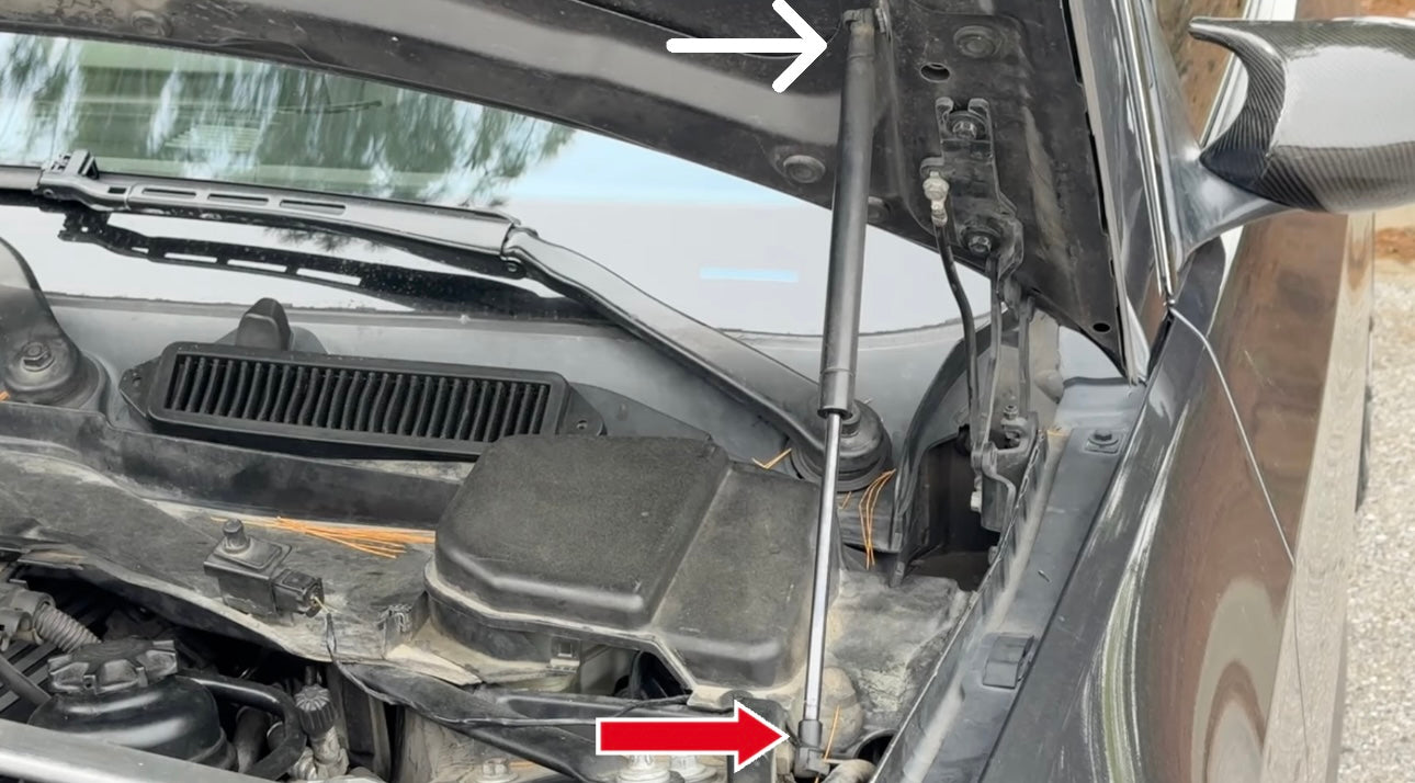 When replacing hood struts to one side at a time to avoid error. The hood struts are attached at either side of the hood at two points, the top (white arrow) and bottom (red arrow).