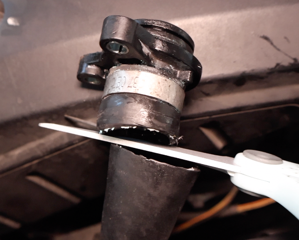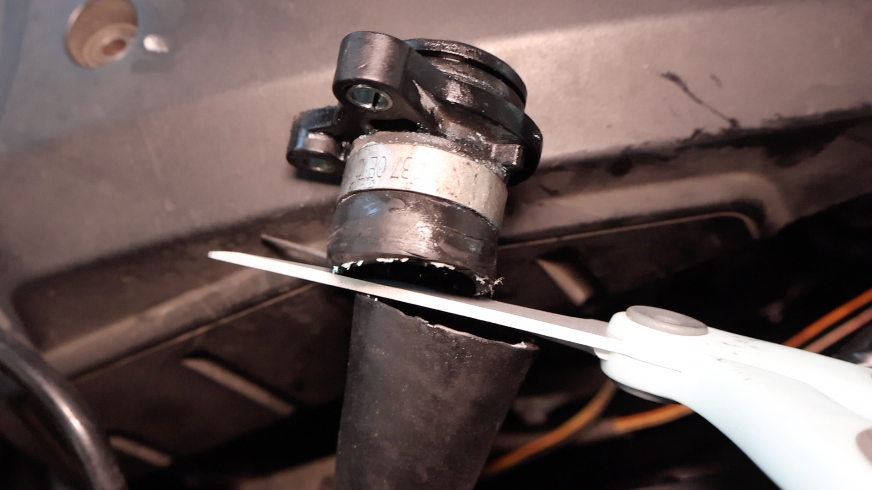 Use a pair of scissors to carefully cut off the factory flange from the hose, ensuring a clean and precise cut. The factory band clamp securing the hose is not removable but can be carefully cut off using a Dremel tool if necessary. However, simply cutting off the old flange is an acceptable solution. The factory hose is sufficiently long and can be extended as needed to accommodate the modification.