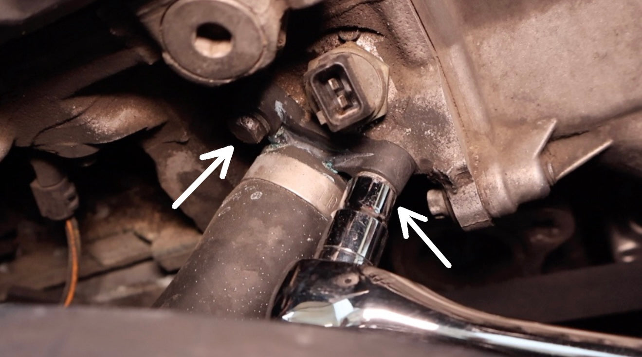 Using a flathead screwdriver, gently pry the factory hose from the cylinder head ensuring not to damage the head.