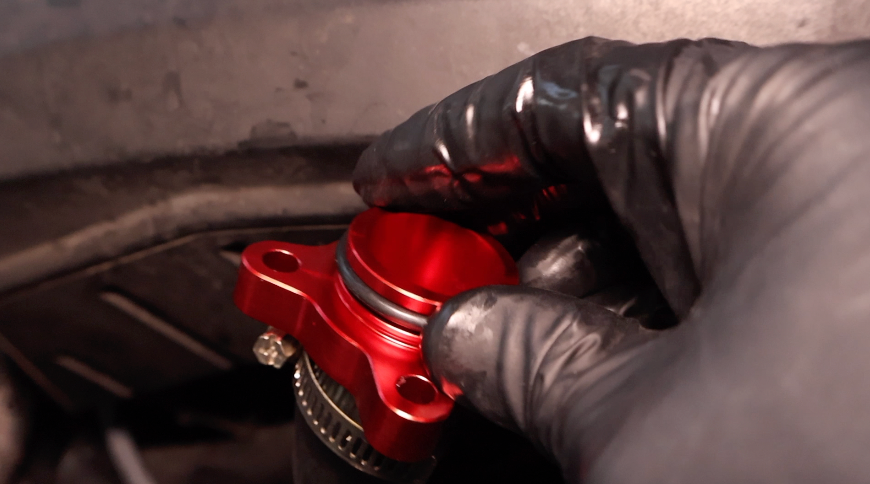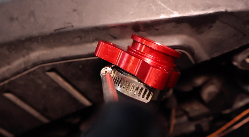 Tighten band clamp around new upgraded metal flange. This new metal flange will future-proof the engine by minimizing chances of future leaks.