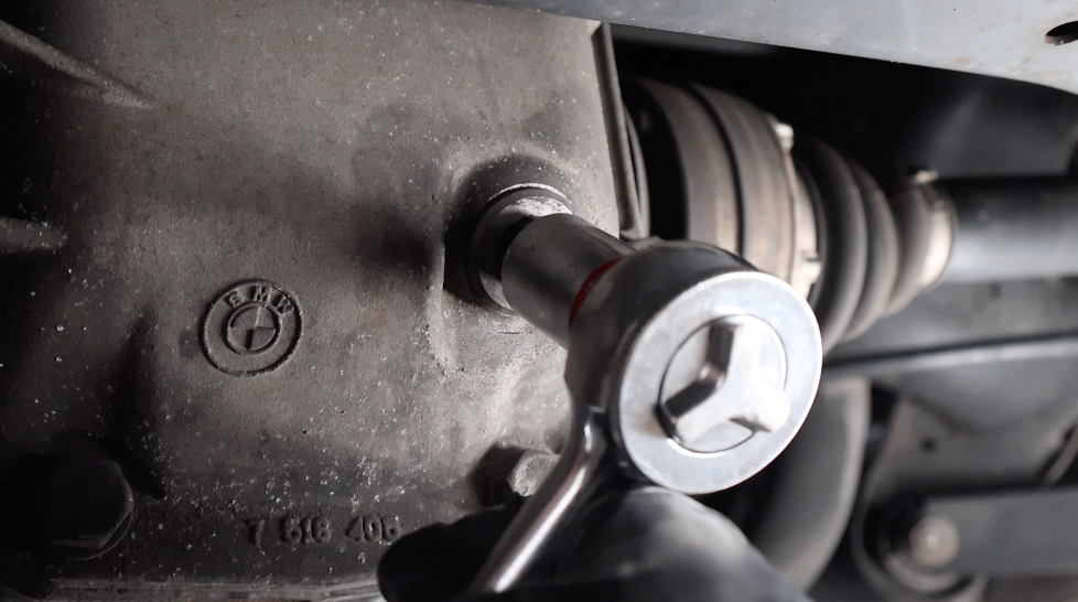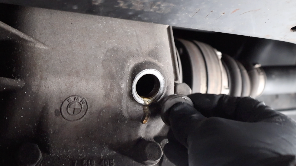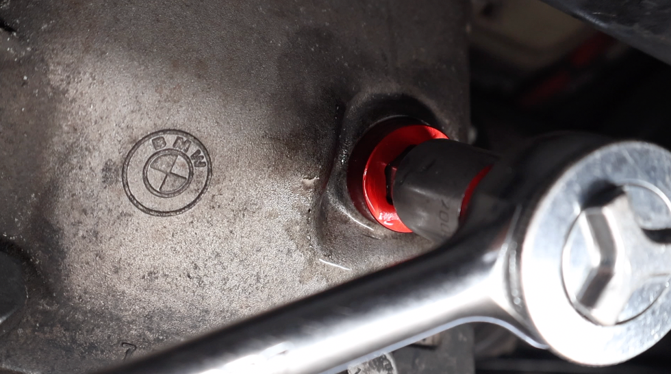 Using a 14mm Allen socket and a ratchet, turn the fill plug counterclockwise to loosen it. On BMW differentials, the fill plug also serves as the drain plug.