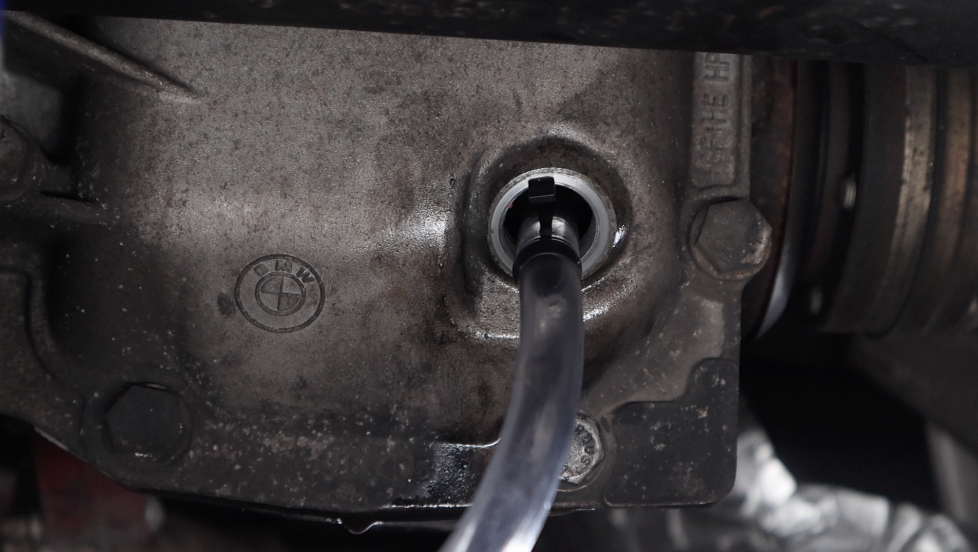 The rear differential on a BMW typically holds between 1 and 1.4 liters of gear oil. This specific E9X model holds 1.2 liters, so continue extracting until this amount has been fully drained from the system.