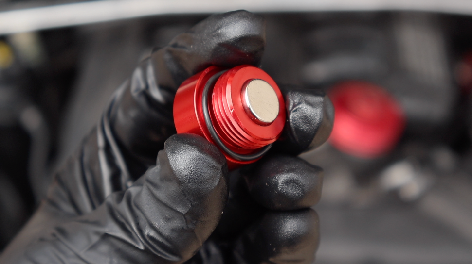 We’re upgrading the differential drain plug to our aluminum version, which features a high-power magnet. This magnet helps capture harmful metal particles that could cause long-term damage to the internal gears. The factory drain plug is smooth metal and does not trap any debris, making this upgrade a valuable addition.
