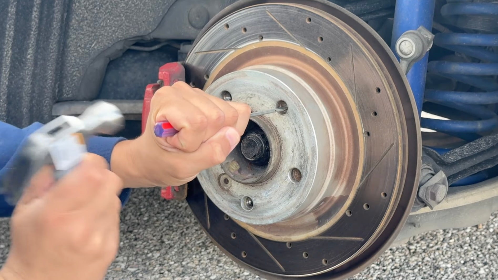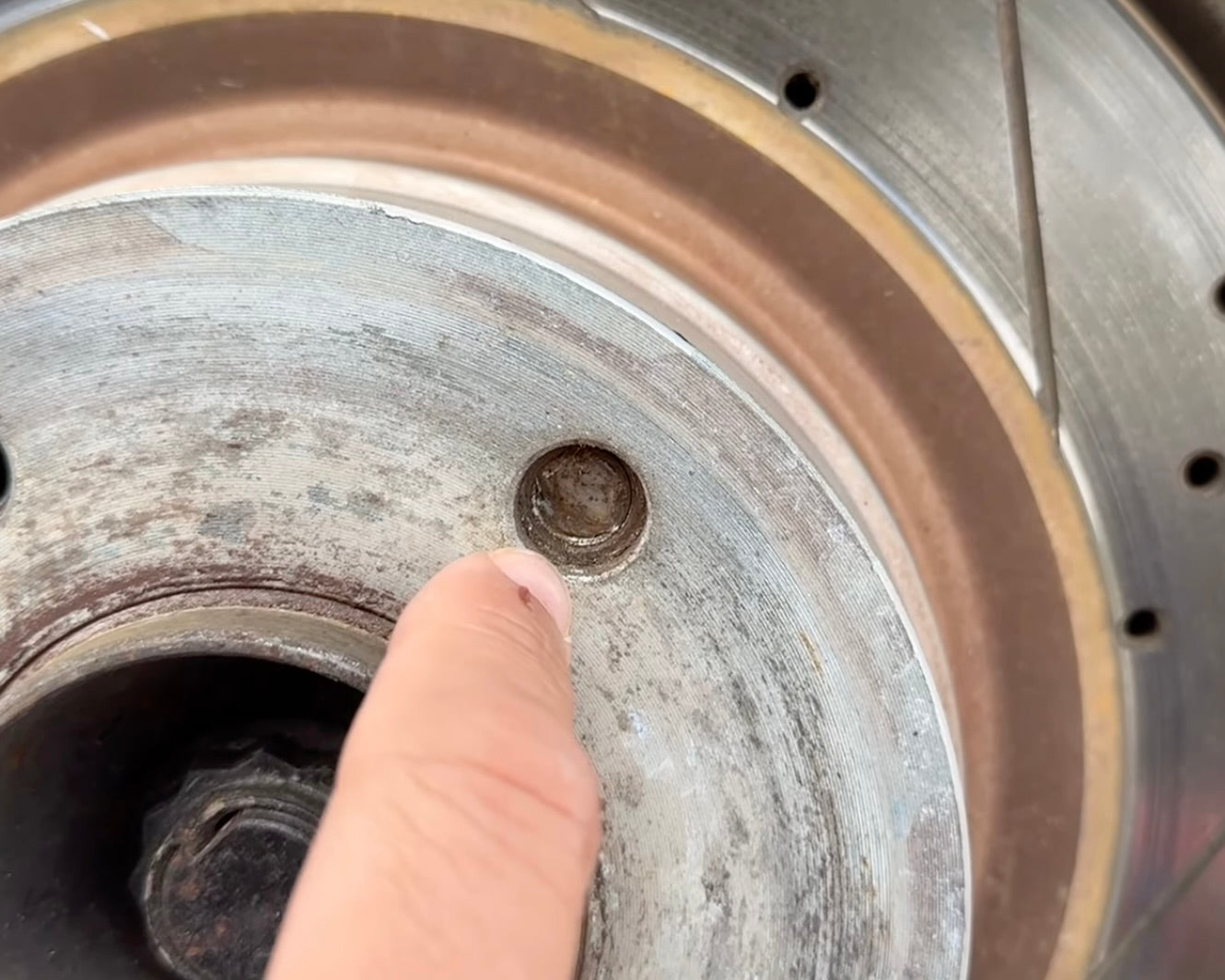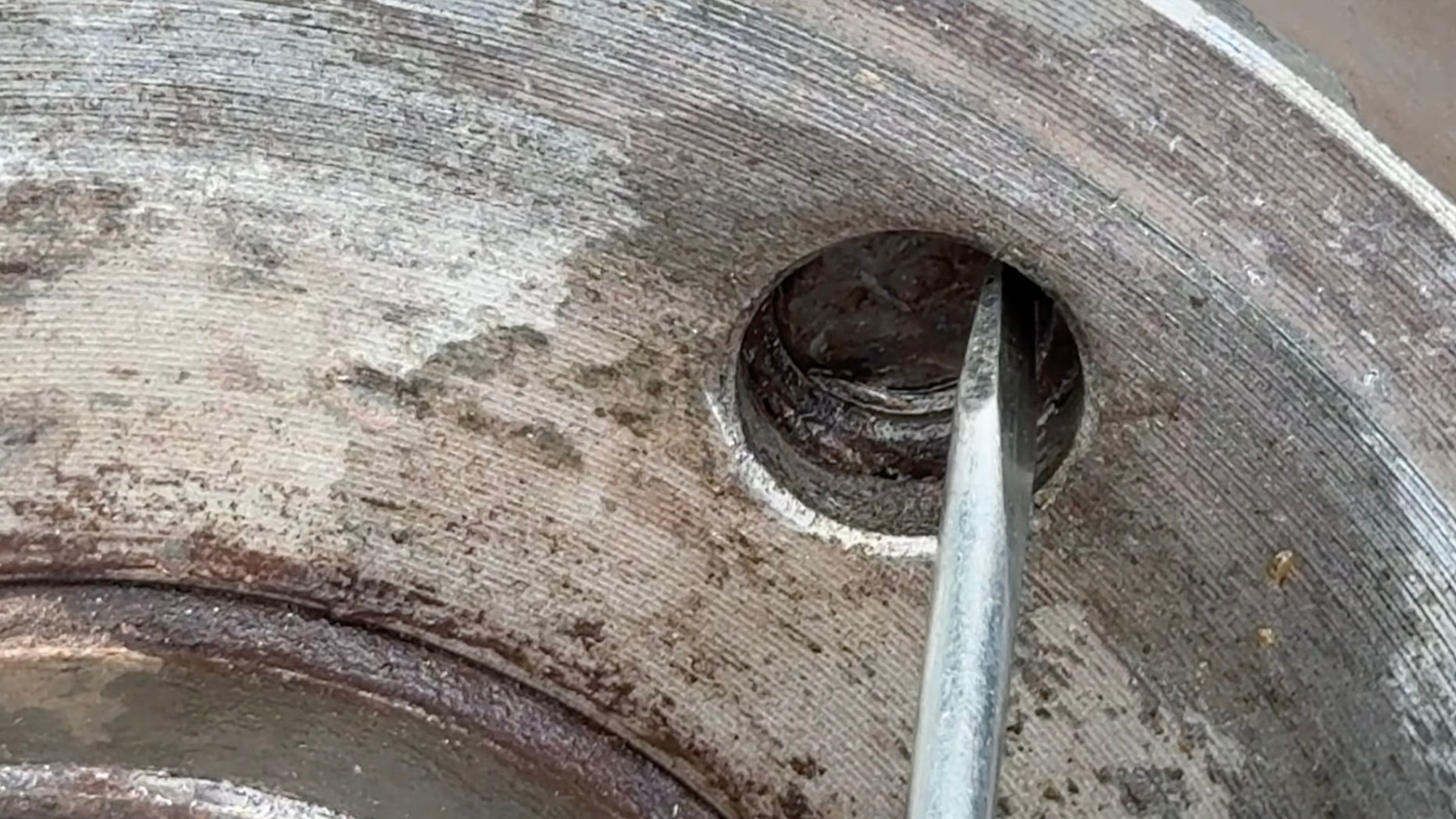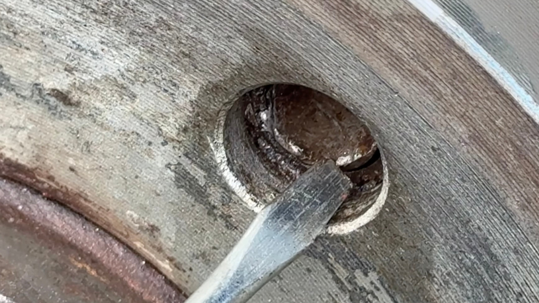 With a new wedge created from the heat of the flame torch, continue to patiently tap the stuck lug nut out in a circular, counter-clockwise motion.