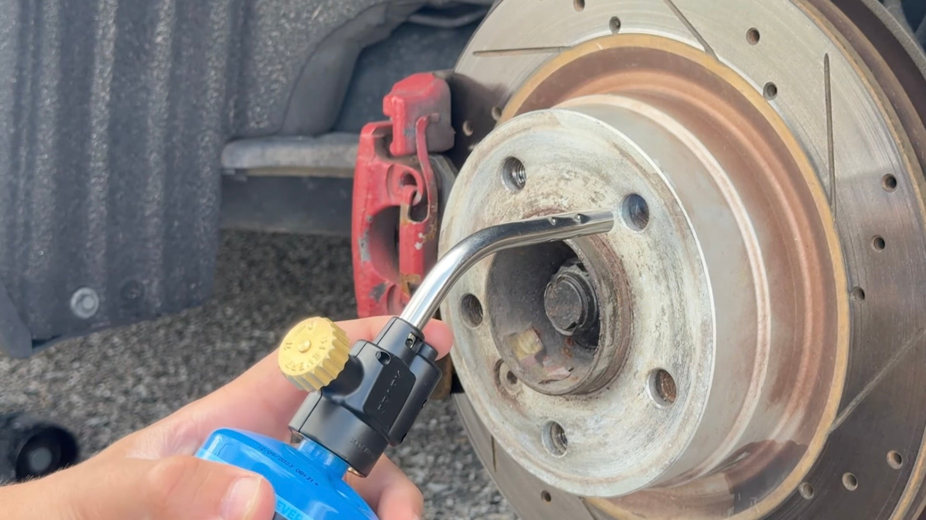 Using a handheld flame torch, apply heat to the stuck lug nut in a long continuous span, moving the torch in small circles. The heat will expand the bolt then contract it as it cools, breaking any remaining corrosion from the threads.