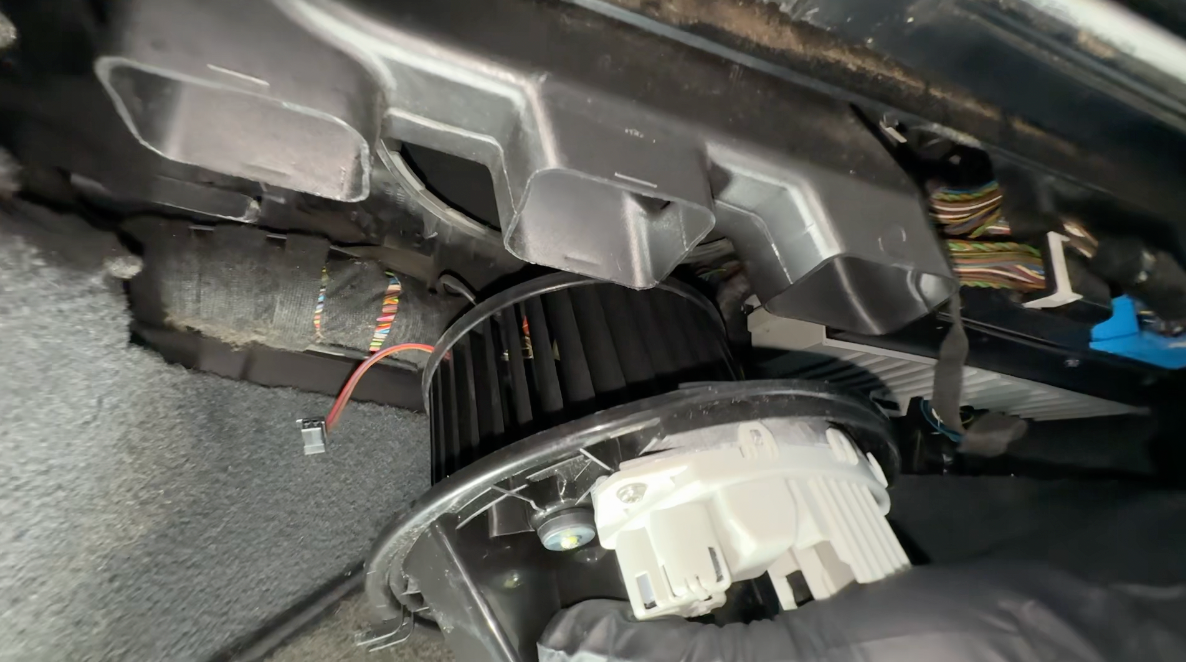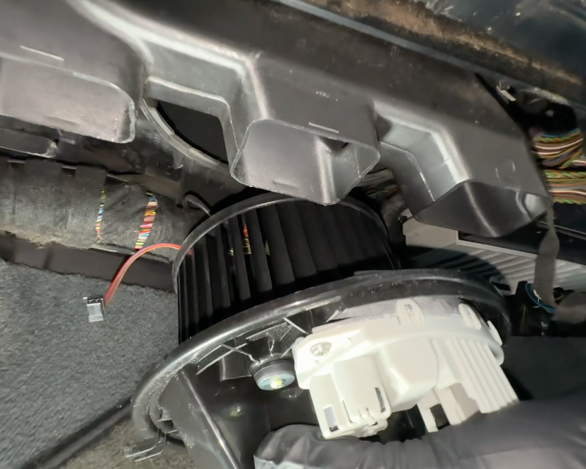Once fully loosened, remove the blower motor assembly from the dashboard by pulling it out ensuring you don't damage the surrounding electrical components.
