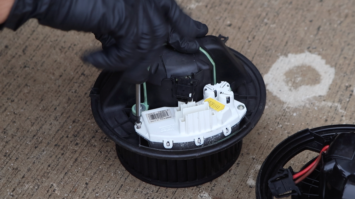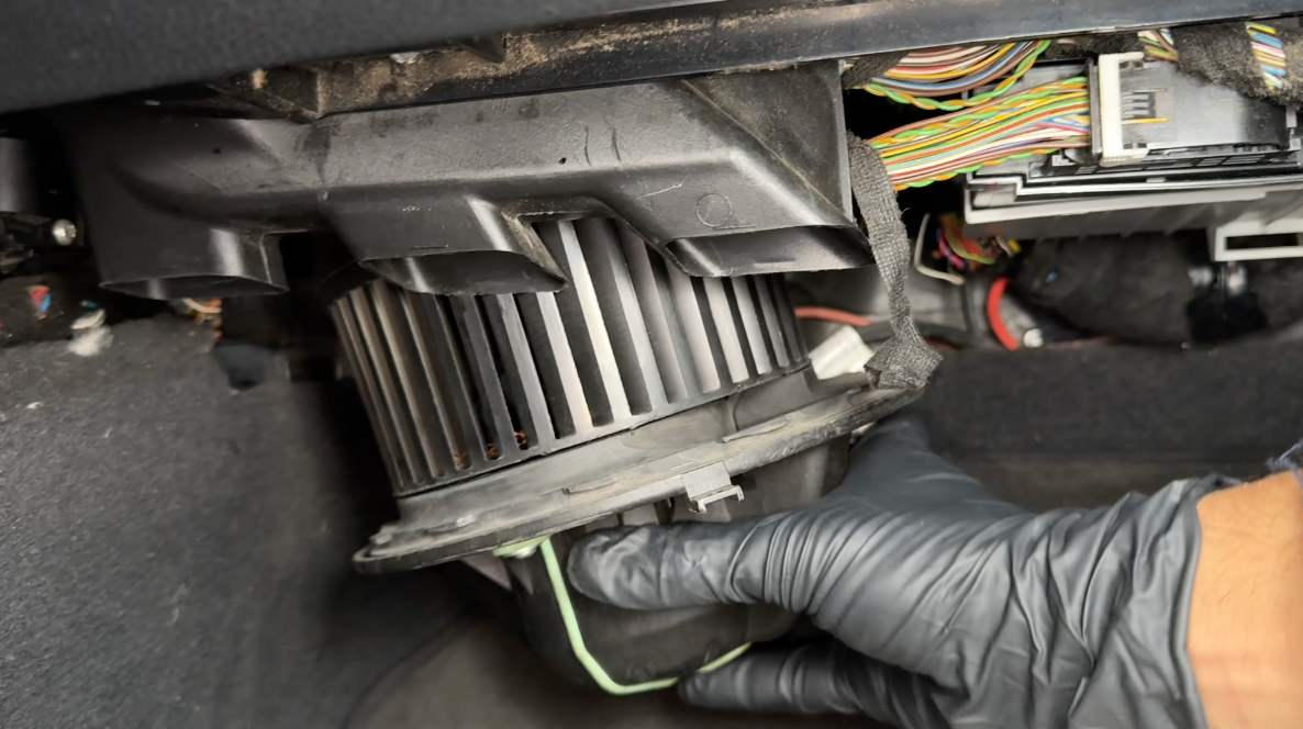 Loosen the blower motor assembly by firmly grabbing it and twisting it clockwise to unlatch it from the dashboard.