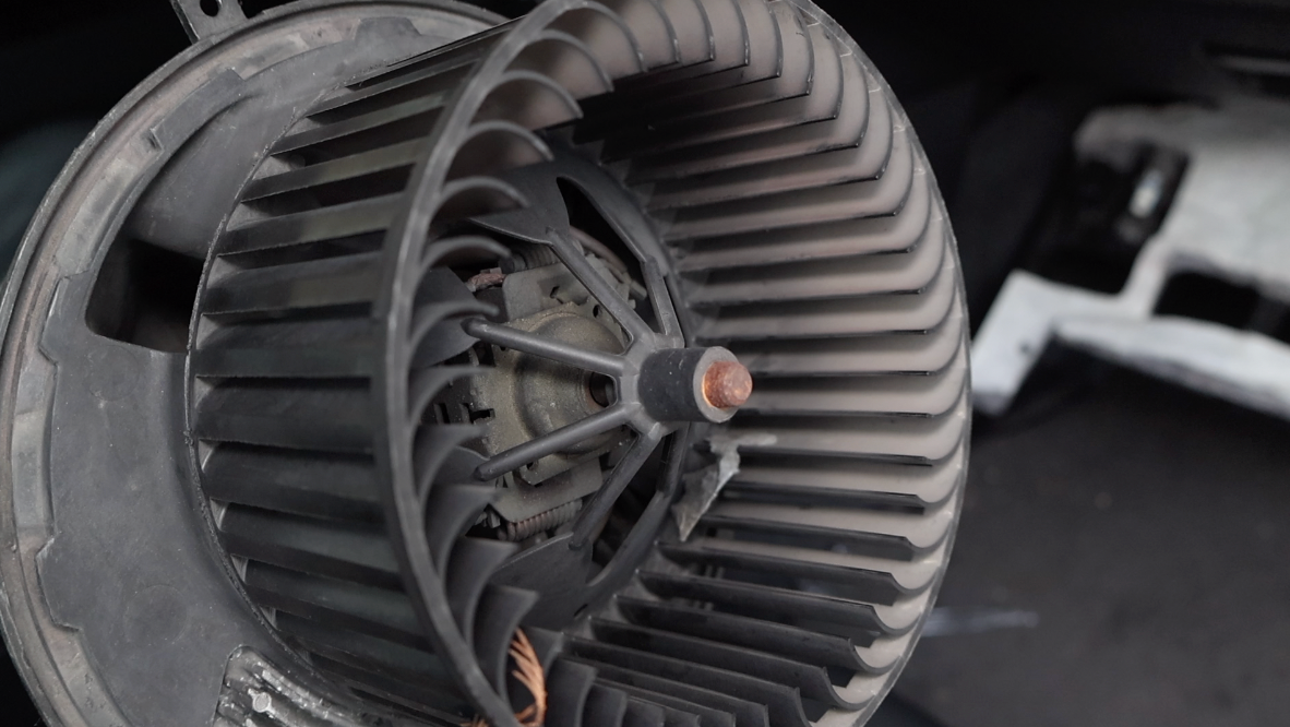 Carefully examine the factory blower motor assembly to determine the cause of its failure. In the example shown, you can see clear signs of rust on the main bearing, indicating water damage. Additionally, the assembly is covered in dust, and a loose piece of copper wiring is visible—likely caught during operation or detached due to wear and tear over time. These are common signs that the blower motor has failed, either from damage or simply old age.