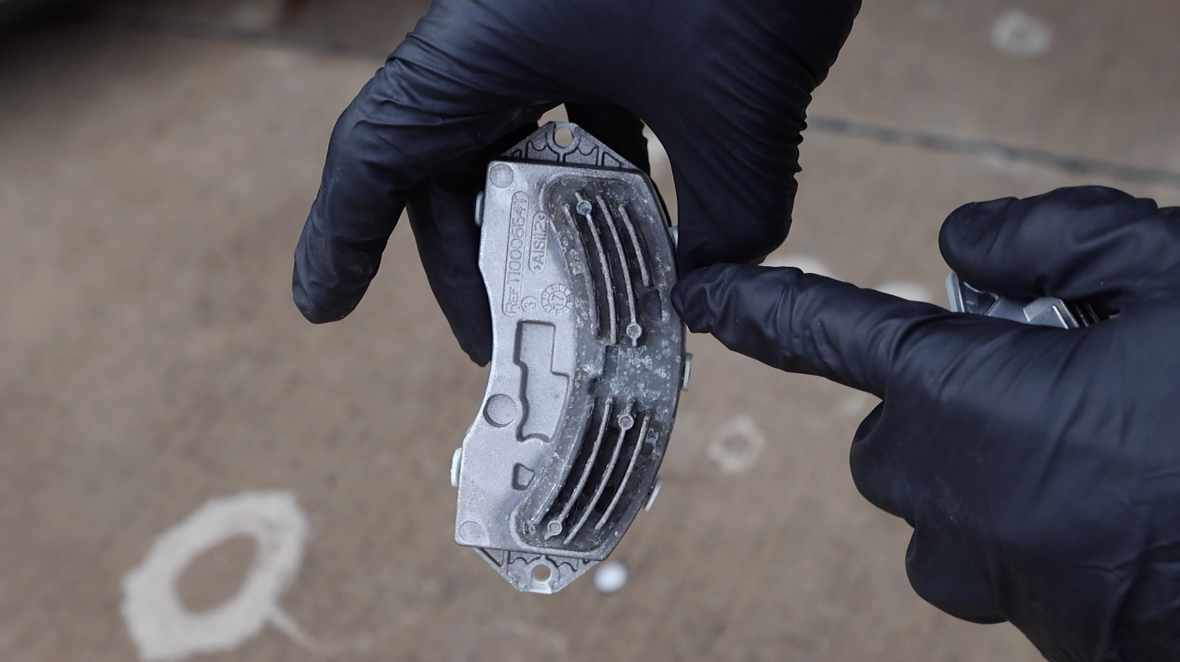 Take a close look at the factory blower motor regulator to identify why it has failed. In this case, the regulator is coated with an aqua-white residue and visible water spots, clear indicators that water has seeped in from the windshield. This water intrusion has likely caused the regulator to malfunction, making it necessary to replace it to restore proper functionality.