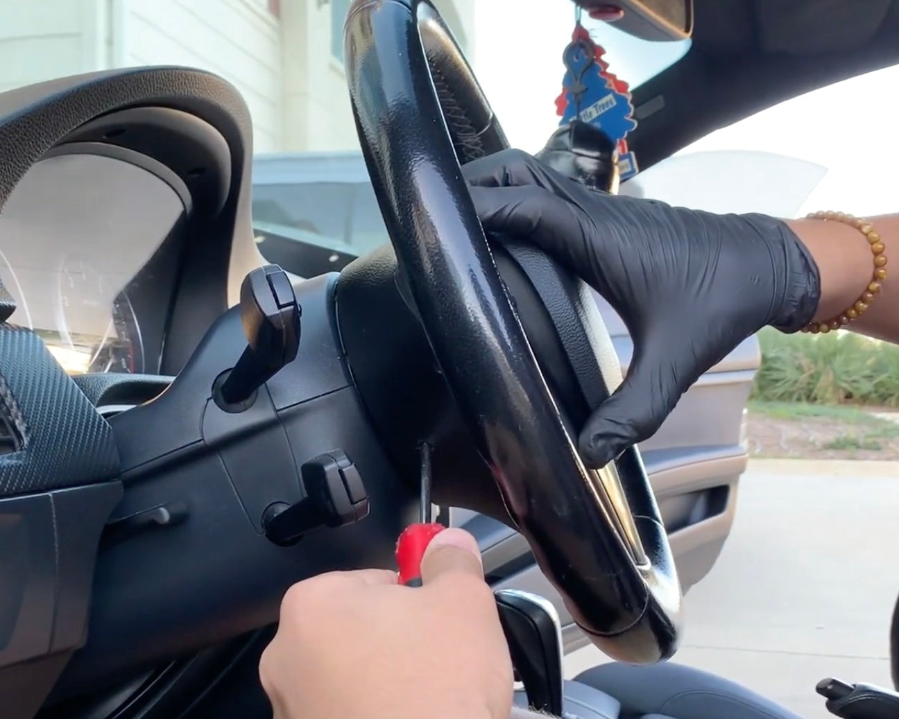 Continue loosening the airbag by using a flathead or T-20 screwdriver at a 45-degree angle to push the airbag retention clip inward. This should loosen the second half of the airbag out of the steering wheel.