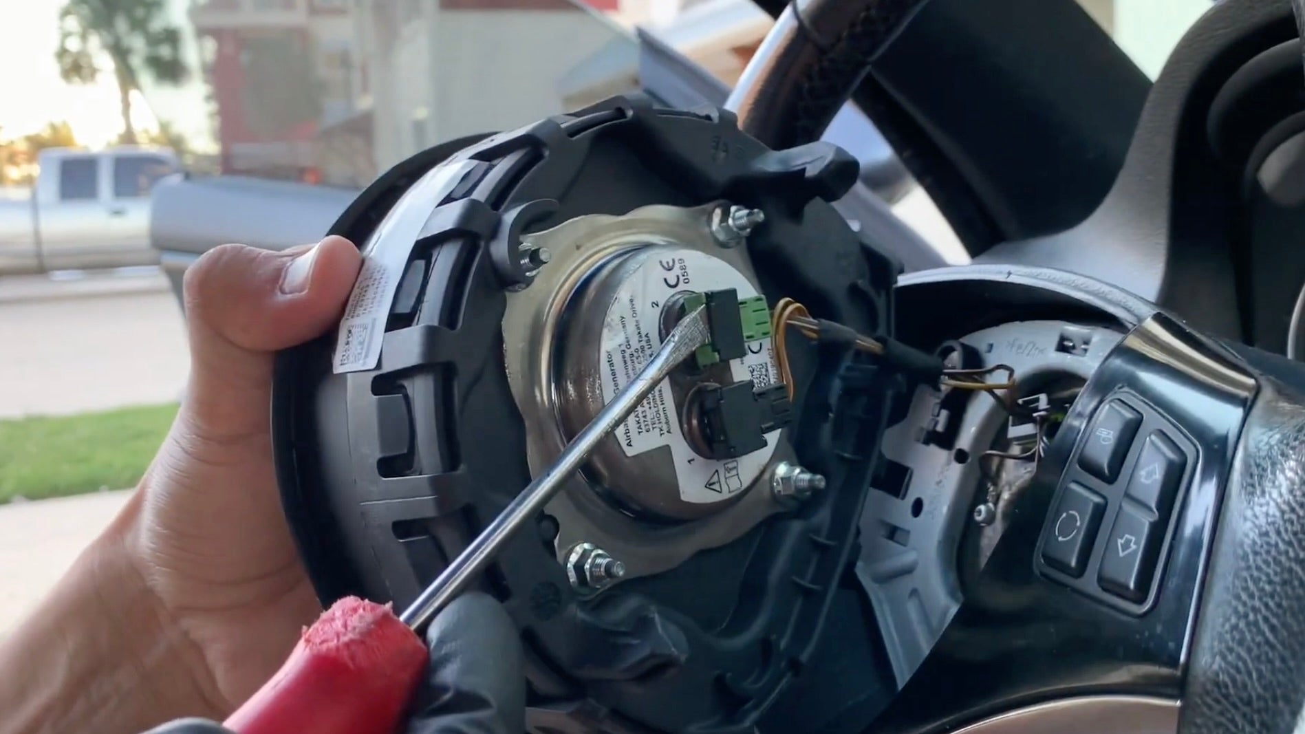Loosen the airbag by using a flathead or T-20 screwdriver at a 45-degree angle to push the airbag retention clip inward. This should loosen one half of the airbag from the steering wheel.