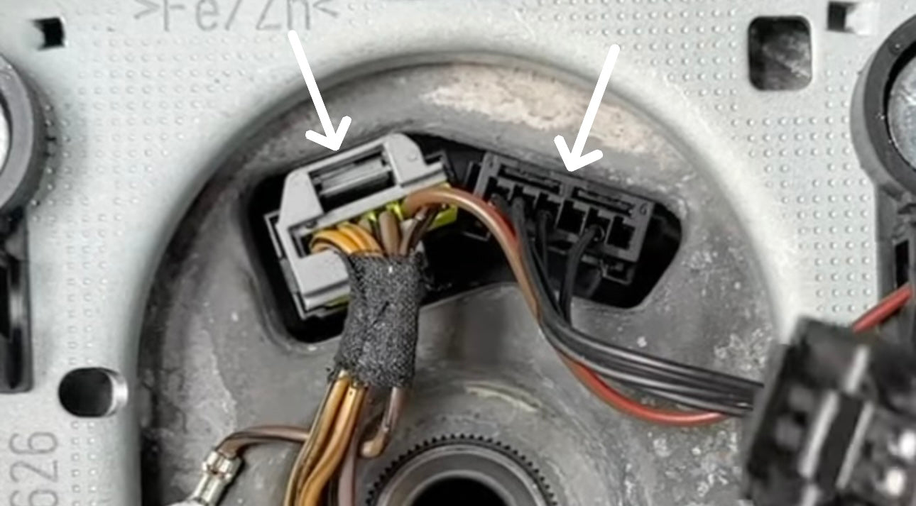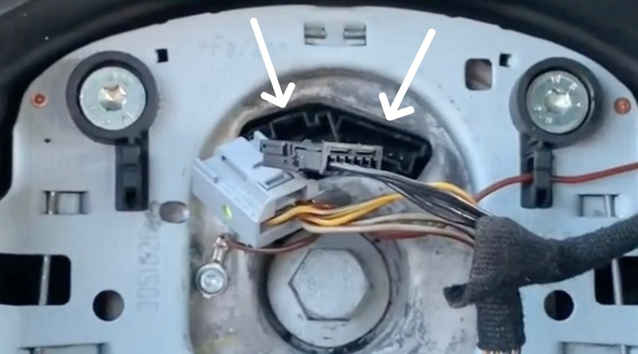 Remove the two steering wheel clockspring connectors (white arrows) by pressing down on the retention tabs and sliding them out of place.