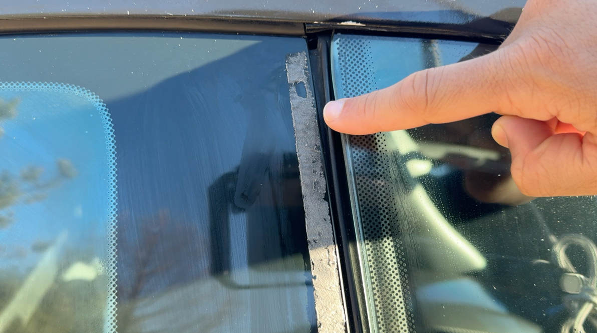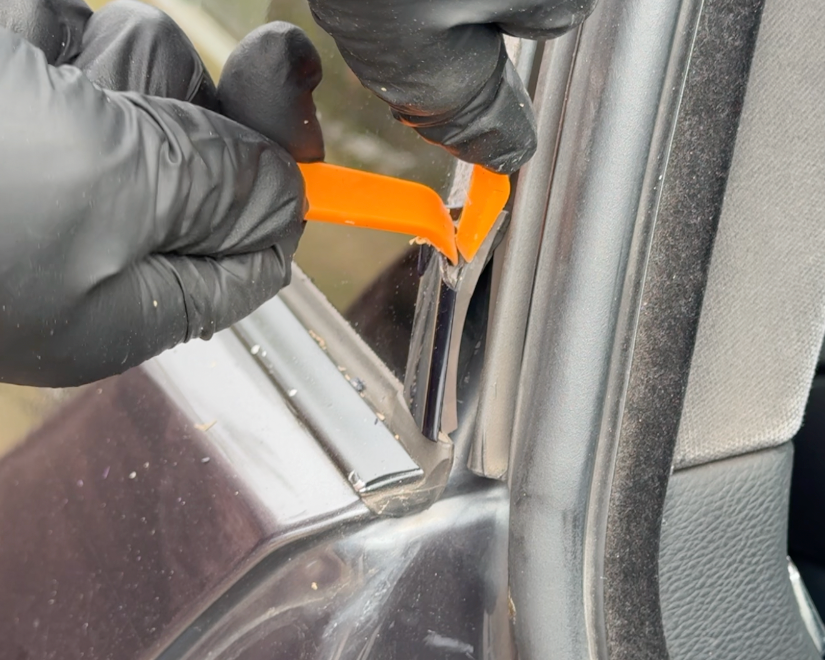 Once you reach the bottom of the window trim, be extremely careful not to damage the small rubber wedge the trim is held to. Use one pry tool to hold the wedge down while you use the other tool to carefully lift the trim piece off.