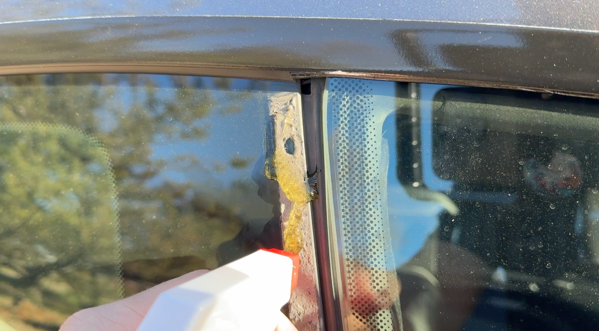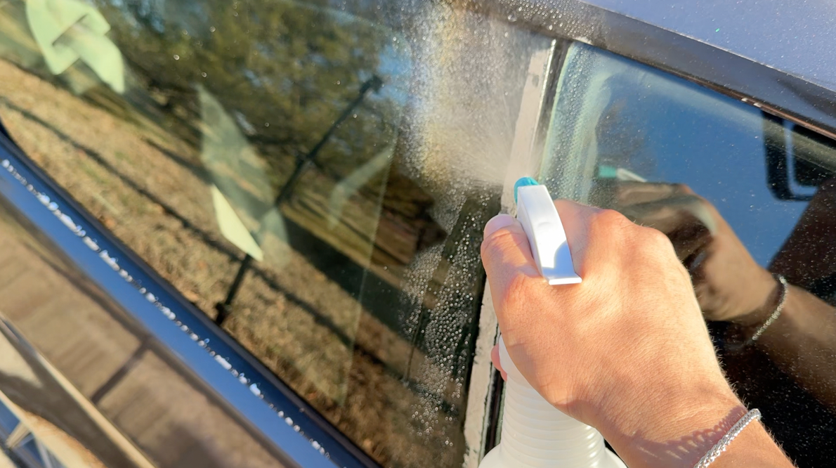 Spray the window with a generous coat of water to remove any of the adhesive removing solution.