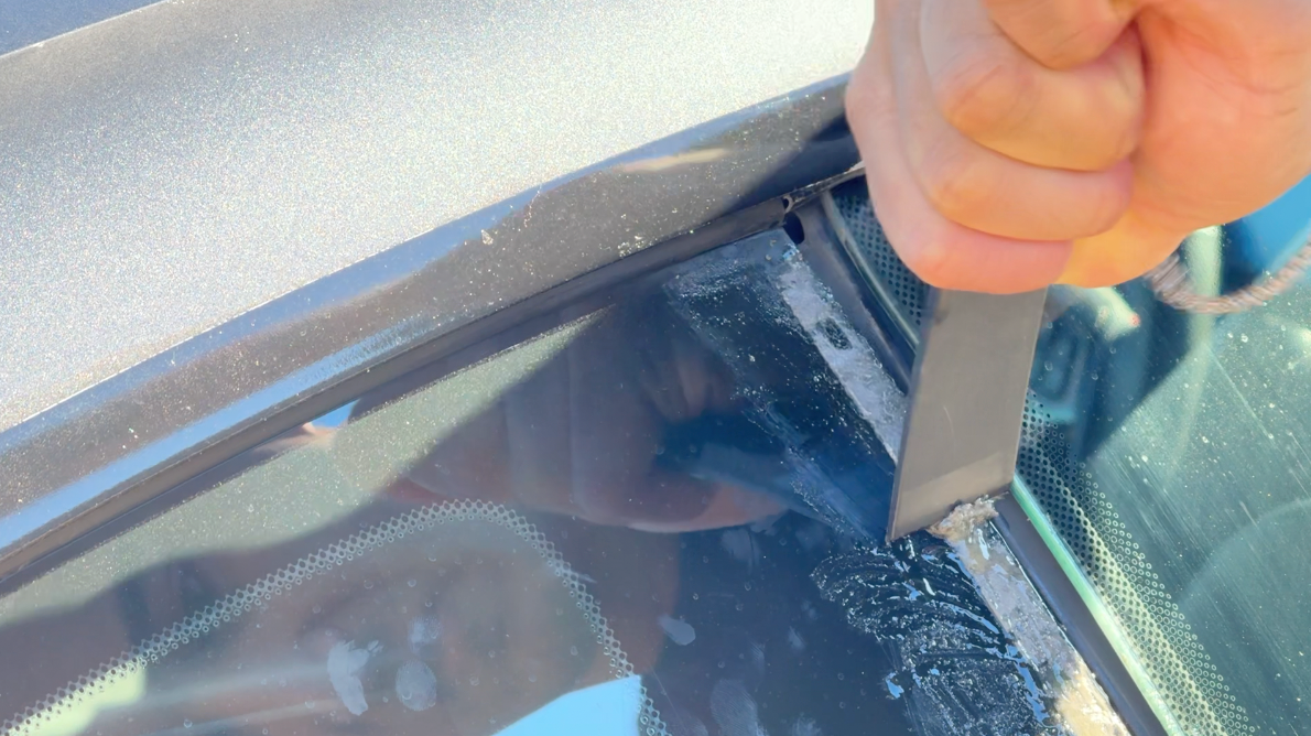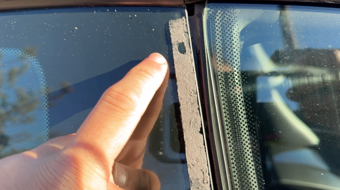 The old adhesive that is leftover on the vehicle's window may not fully come off. For best results, continue scraping until only a thin, even layer is left behind. Ensuring the old adhesive is at least a flat surface will help the new window trim bond permanently.