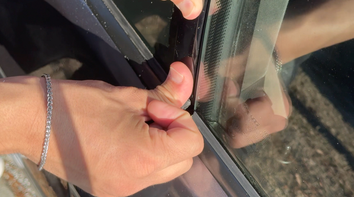 After verifying the new window trim is fully aligned and the window will not get caught on it, press the trim piece down firmly allowing the new adhesive to bond to the vehicle.