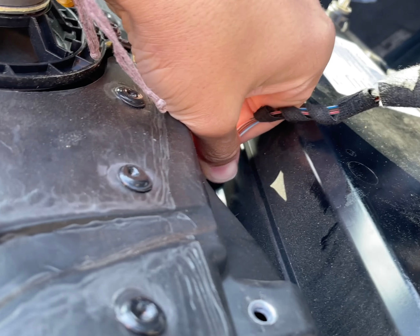Unplug the bottom puddle light by depressing the retention tab and pulling it out of the light assembly.