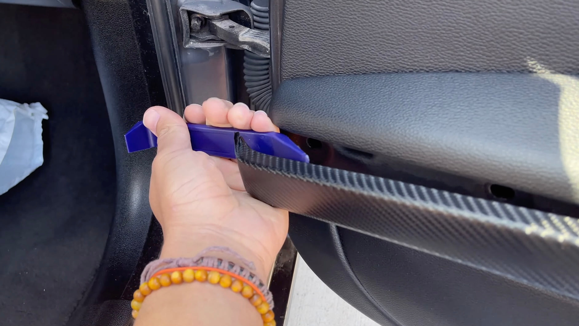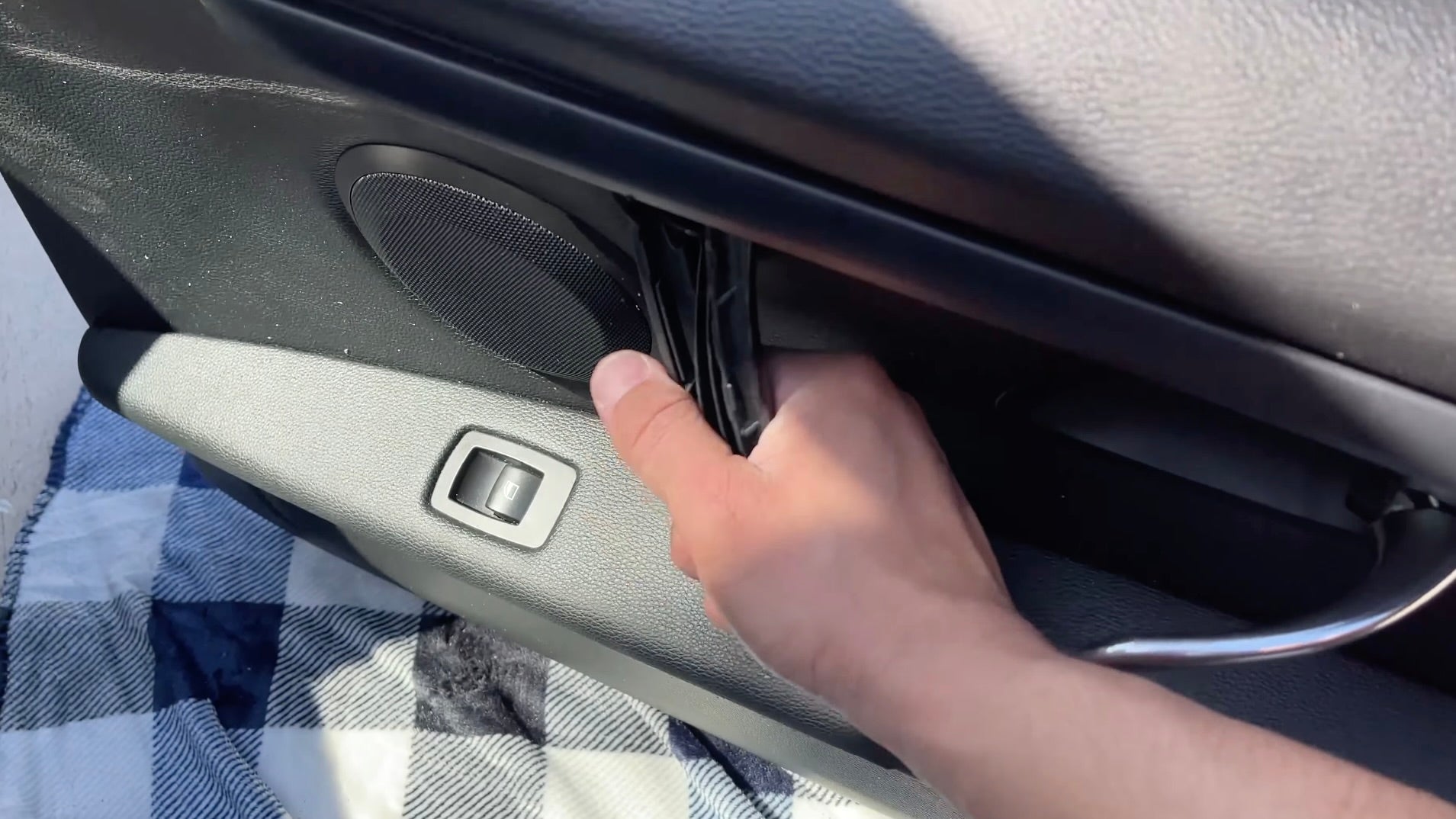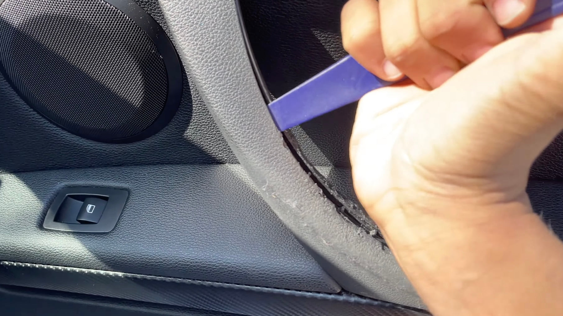 Remove the door panel trim by fitting a pry tool under the trim and carefully lifting up.