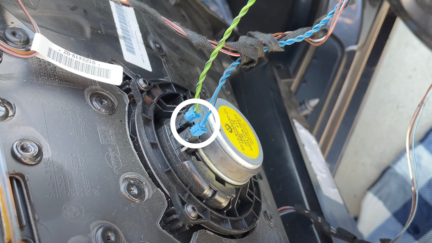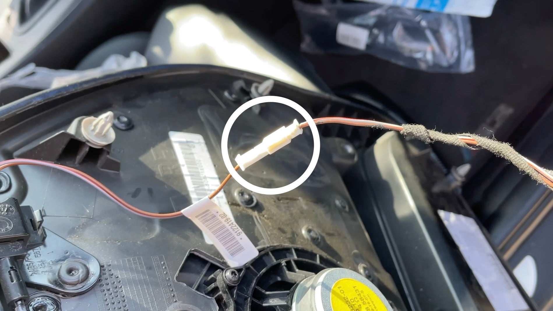 Unplug the speaker cables (white circle) by depressing the retention tab and sliding the connectors from the speaker.