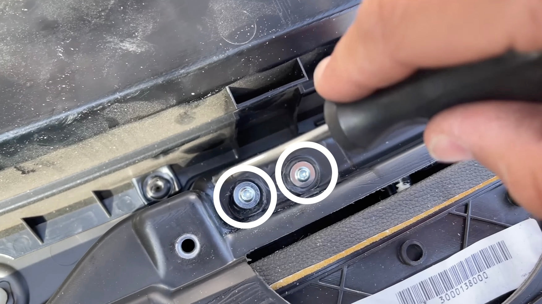 Remove the two top rivets (white arrows) holding the top of the pull handle in place. Do not touch the top rivot (red x).