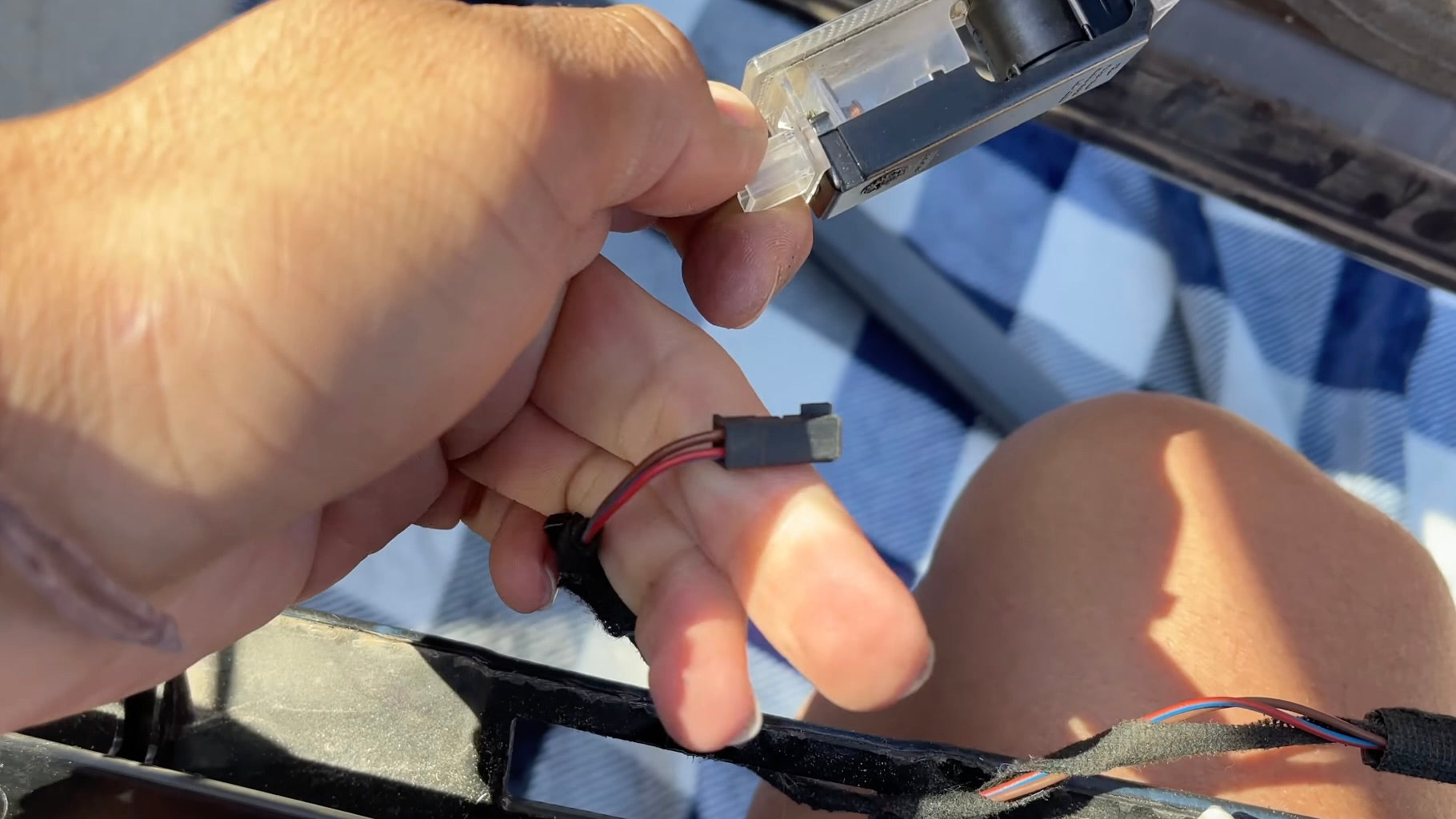Unplug the white connector by depressing the retention tab and pulling the two halves apart.