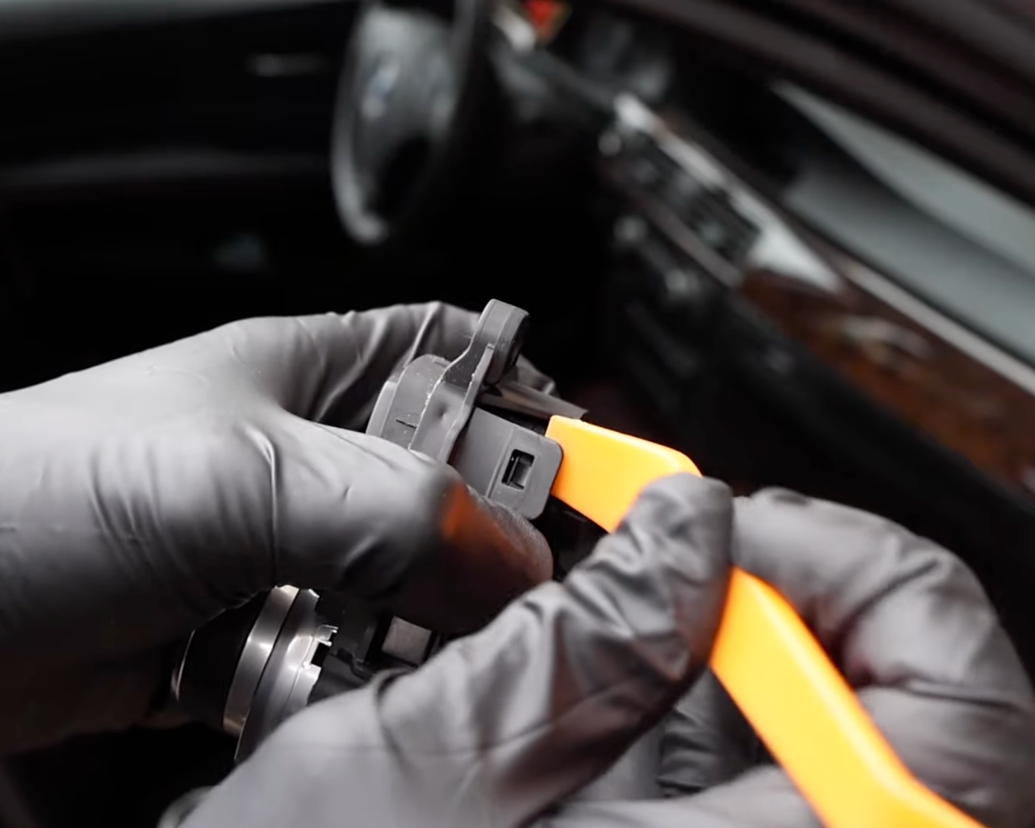 Start by using a plastic pry tool to gently lift up the rear section of the center console trim. This will give you access to the iDrive controller.