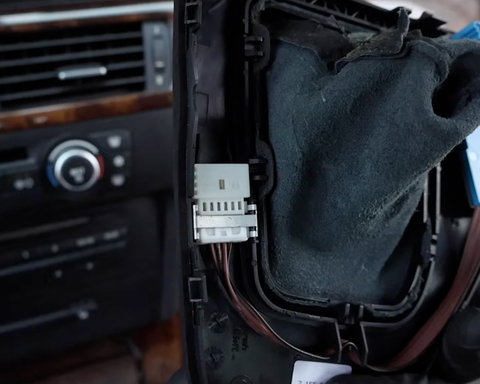 With the rear clips released, firmly grip the center console trim and begin unclipping the front section. Lift the trim upward to expose the CIC controller’s electrical connector.