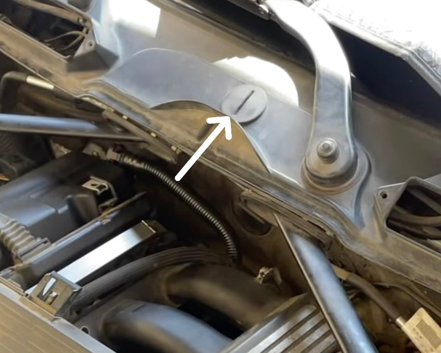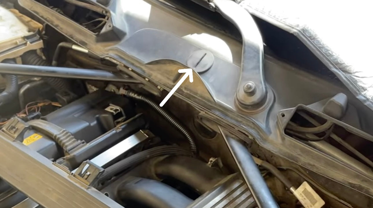 The E18 strut support screw is located underneath the plastic cap near the windshield wiper. Use a large flathead screwdriver to turn the cap to the unlocked position.