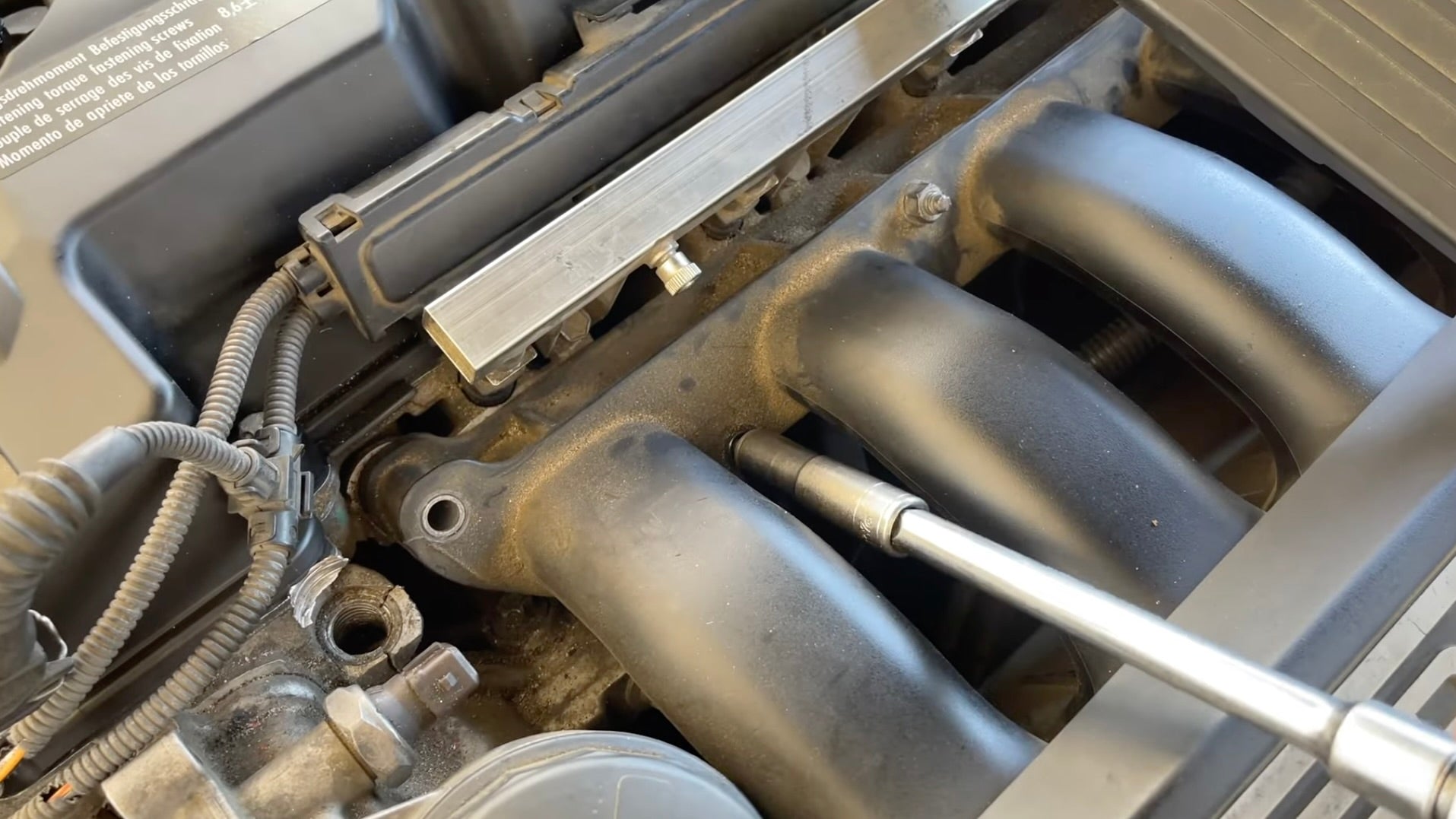 Remove the driver-side engine strut support using an E14 and E18 socket. This will give enough room to move the intake manifold and replace the gasket.