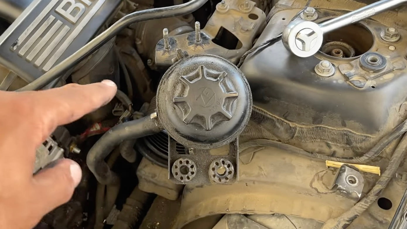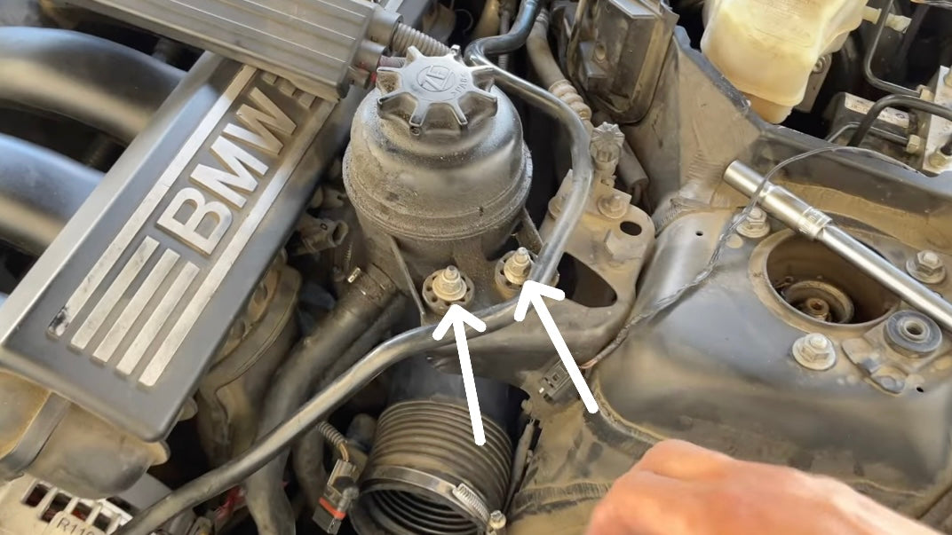 Remove the two 10MM nuts that hold the power steering reservoir to the chassis.